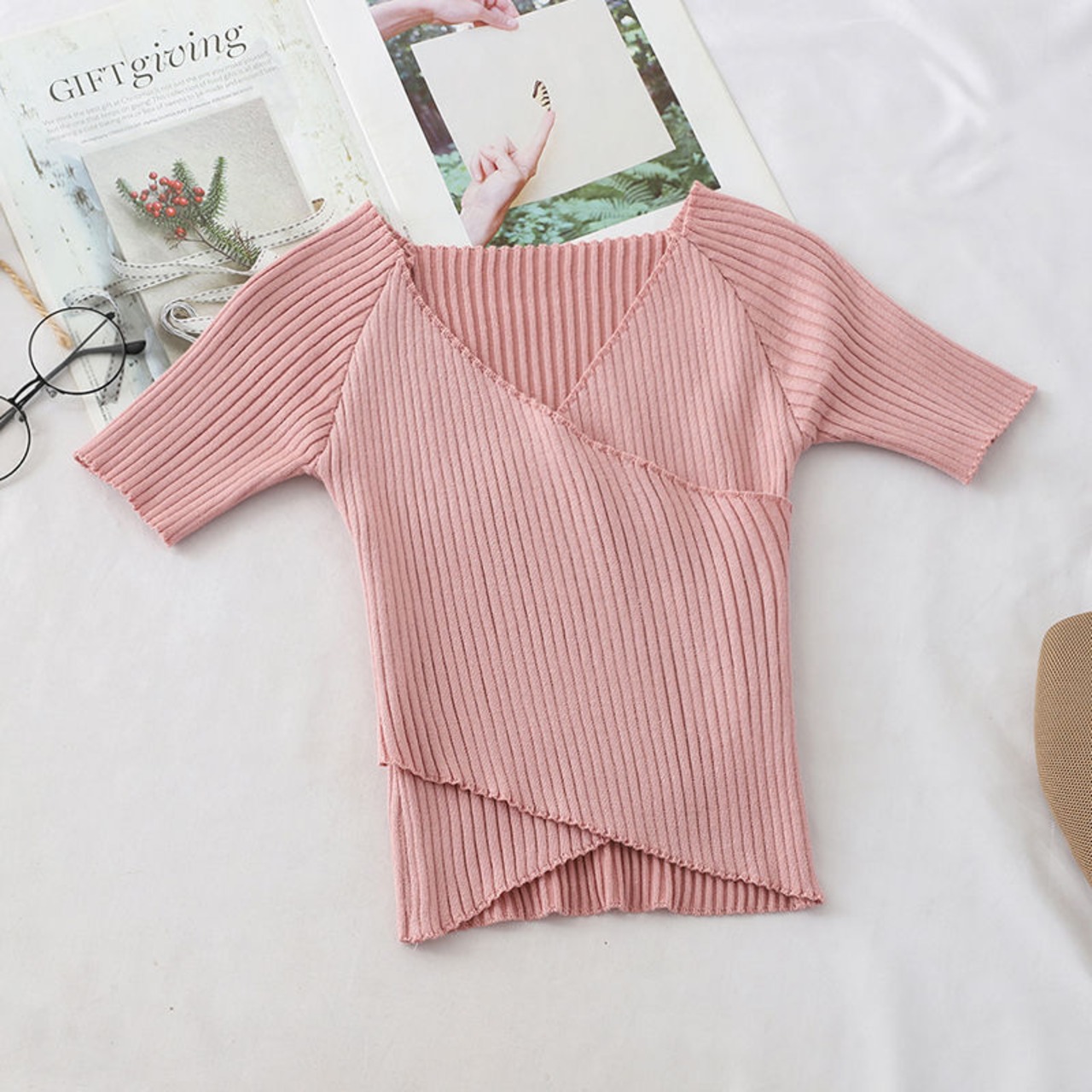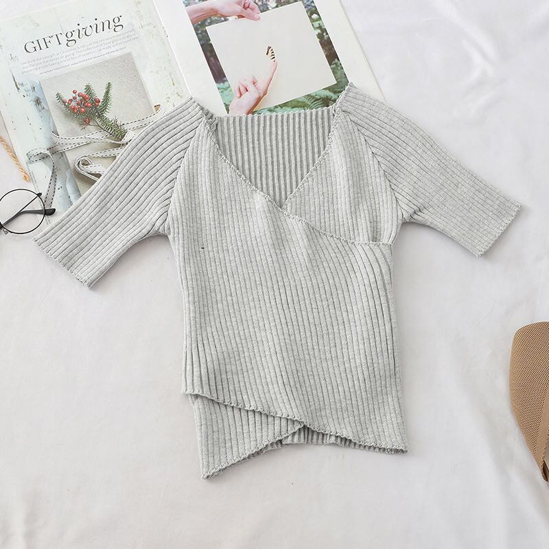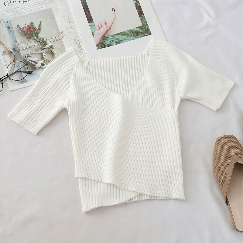 レディース サマー 2021 スキニー Vネック 半袖 Tシャツ ニット スリム ブラウスとシャツ トップス Y2k 美学 ショート ハーフスリーブ 夏物