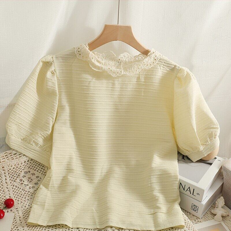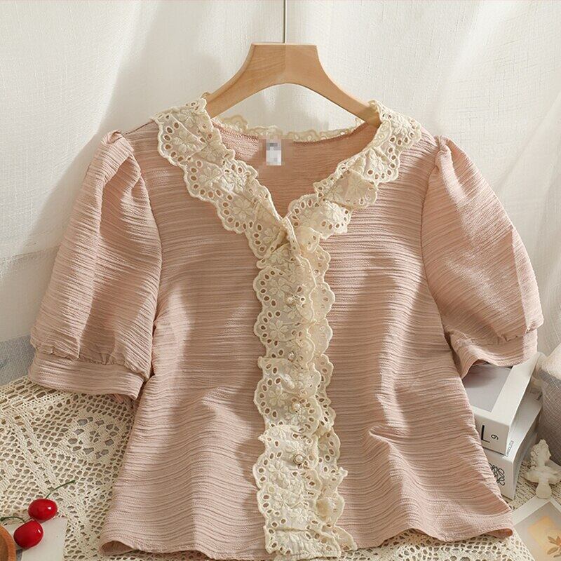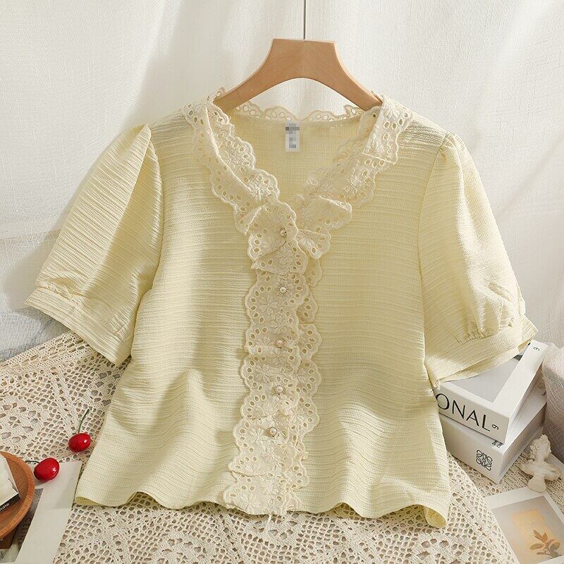 レース ボタン アップ シャツ V ネック半袖ブラウス女性夏 2022 ストリート トップス ショート ハーフスリーブ サマー 夏物 Vネック