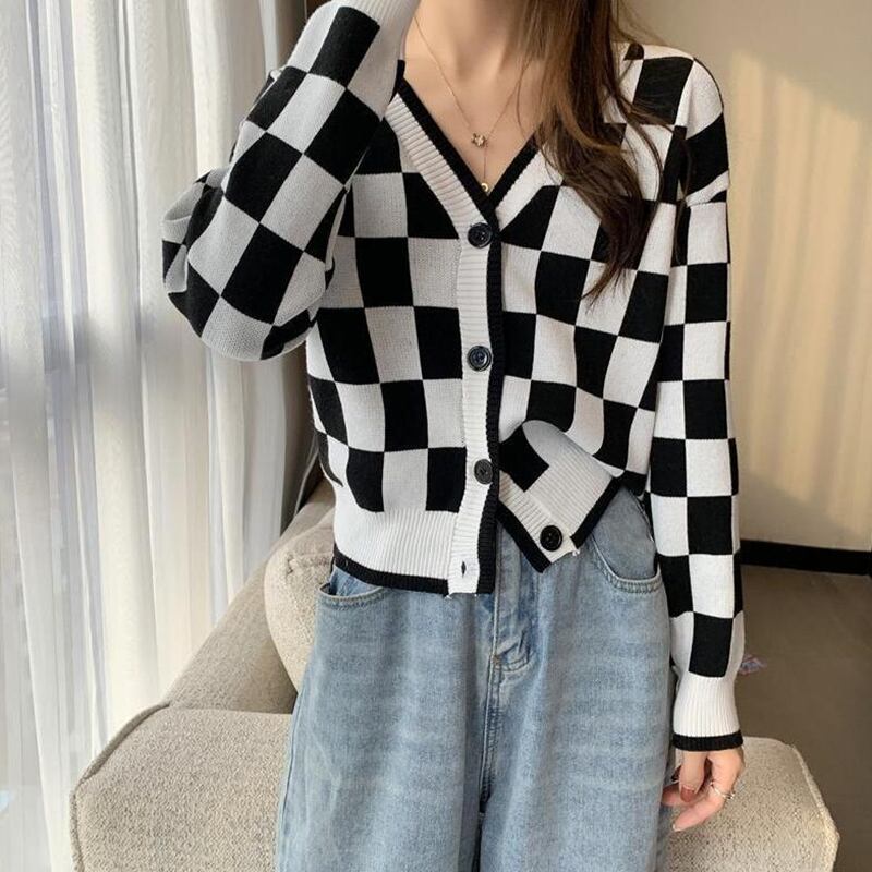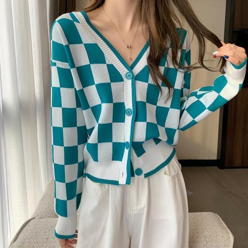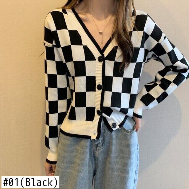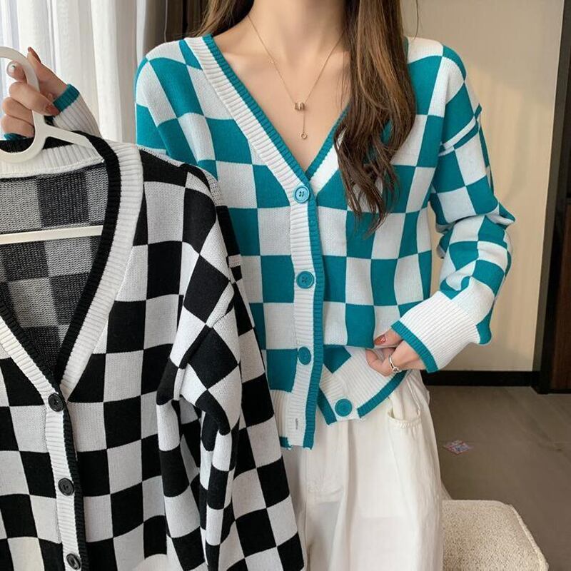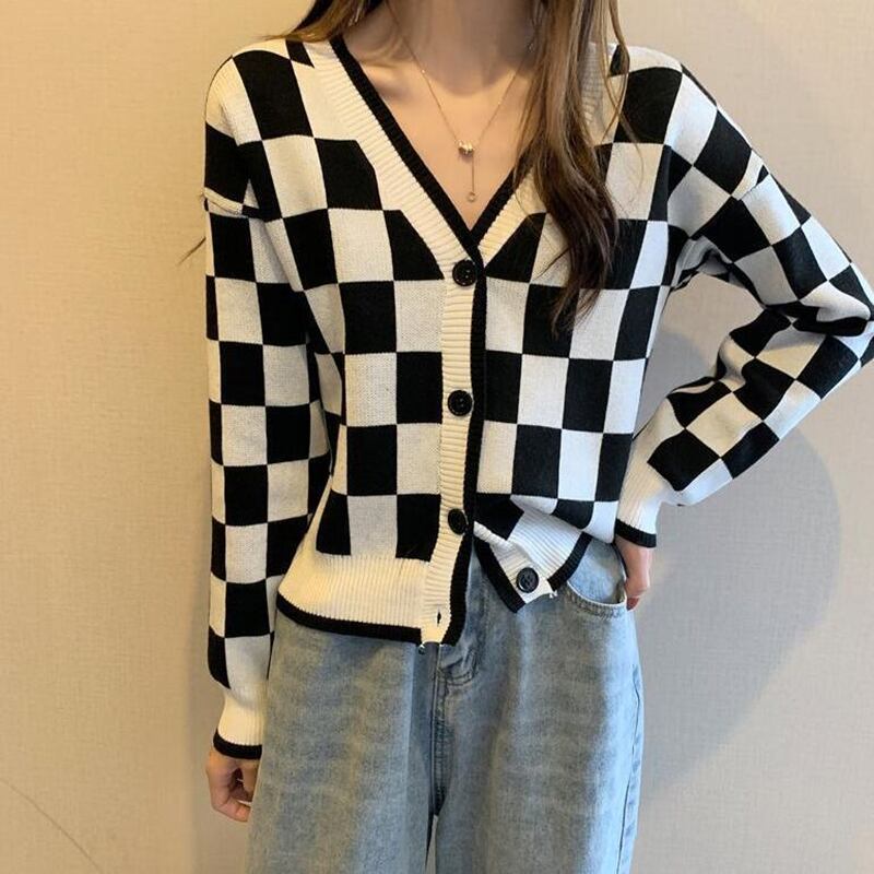 レトロな千鳥格子 V ネック長袖ニット トップ女性の秋コントラスト チェック柄ルーズ ショート シングル ブレスト カーディガン コート ロング オータム 秋物 Vネック