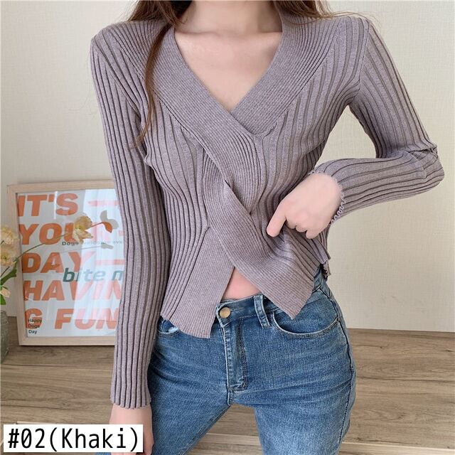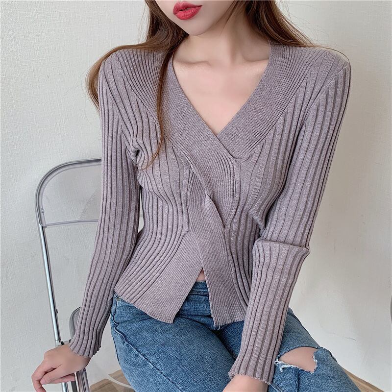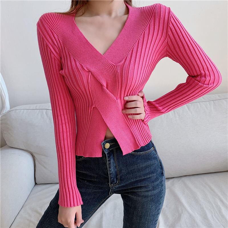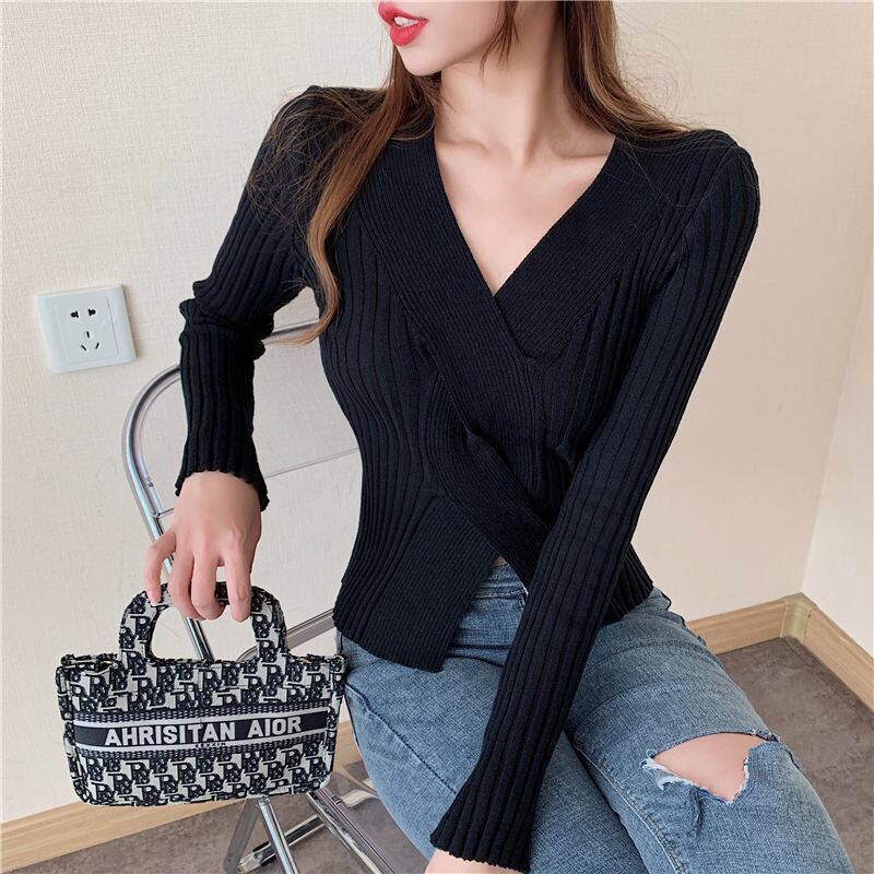 女性の秋/冬のセクシーな深い V ネック クロス リブ ニット トップ スタイル ショート ロング スリーブ スリム ボトムス セーター 長袖 オータム 秋物 ウィンター 冬物 Vネック