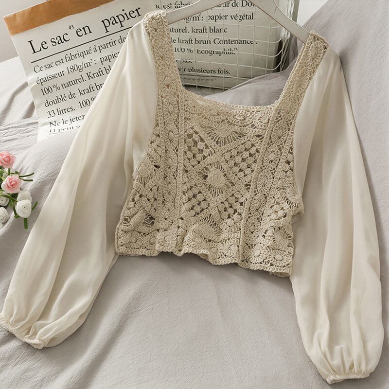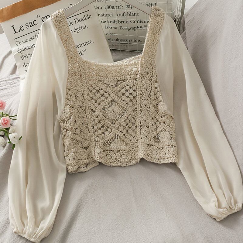 2021 女性の秋薄型シャツシックな中空パフスリーブスクエアカラースリムブラウストップス服プルオーバー オータム 秋物 スクウェア