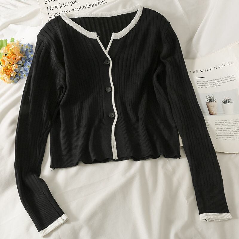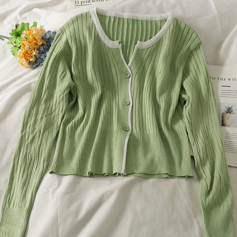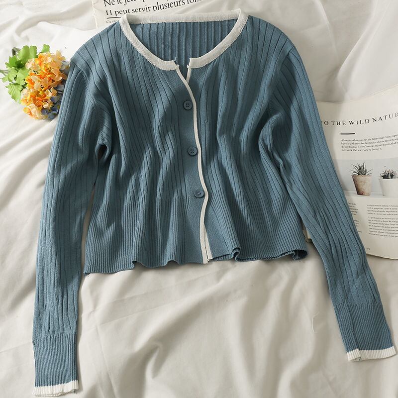 秋 2021 女性パッチワーク O ネックシングルブレスト長袖クロップドセーターリブボタンカーディガンスタイルトップス ロング Oネック