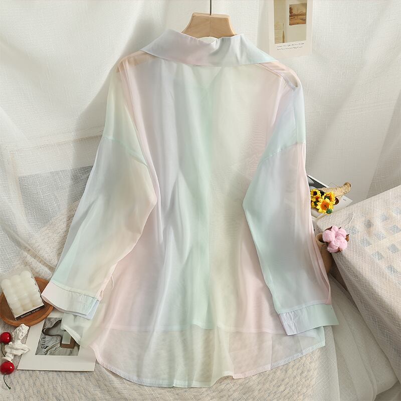 女性の夏 2022 薄型カーディガン透明ブラウスラペル緩い日焼け止めシャツ長袖ボタンアップトップス ロング サマー 夏物