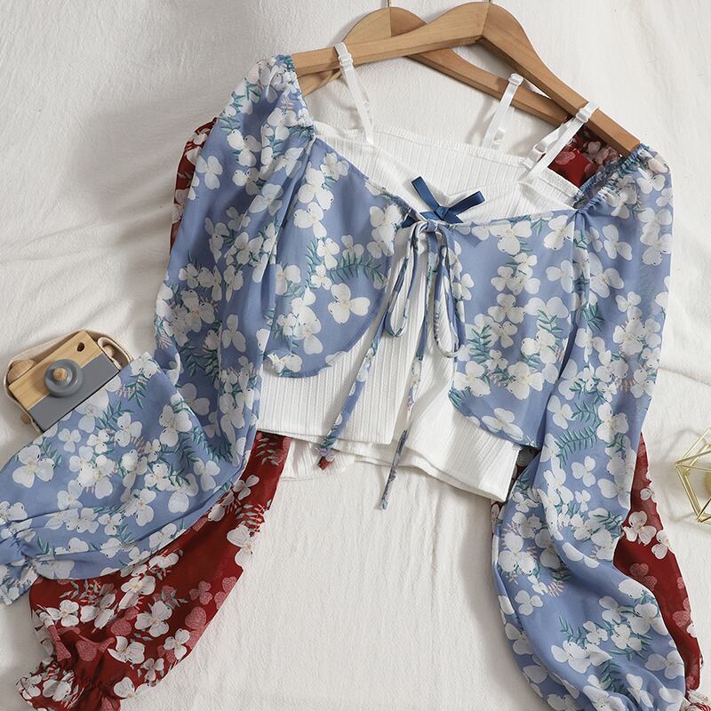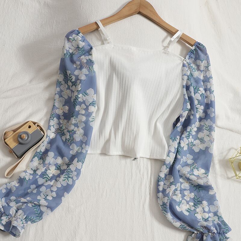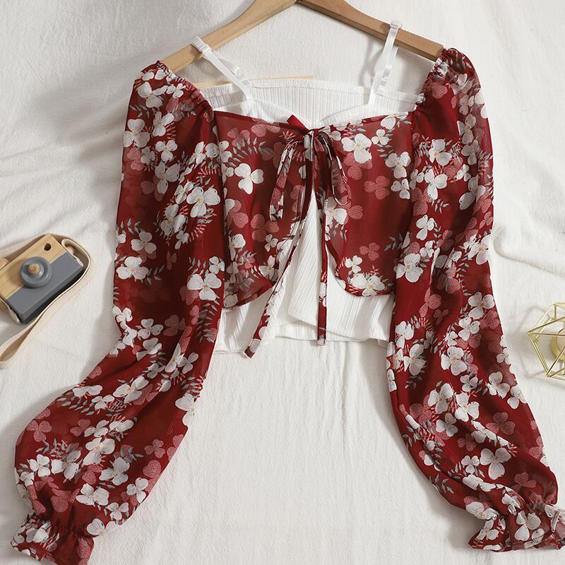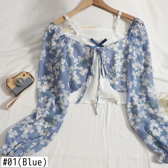 女性シャツブラウスシックなオフショルダーフェイク二枚長袖 Tシャツスタイルクロップトップスリム花柄トップス ロング