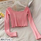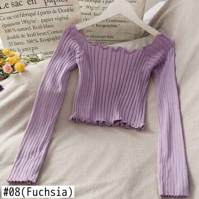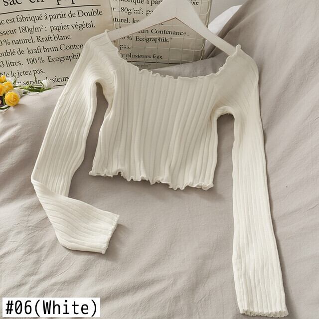 レーストリムオフショルダーベアウエストスリム長袖 Tシャツレディース春秋クロップトップニットブラウスソリッドベーシック Tシャツ ロング スプリング 春物 オータム 秋物 ソリッドカラー