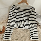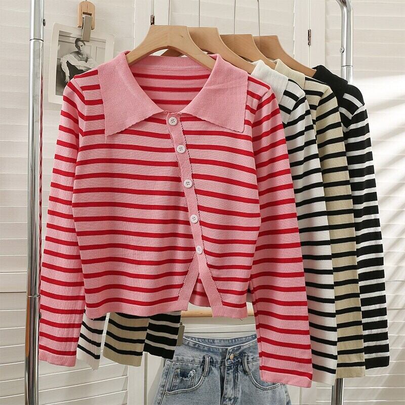 2022 ストライプボタンアップシャツ女性春秋スタイルニットセーター長袖 Tシャツ原宿ラペルブラウストップス ロング かわいい スプリング 春物 オータム 秋物