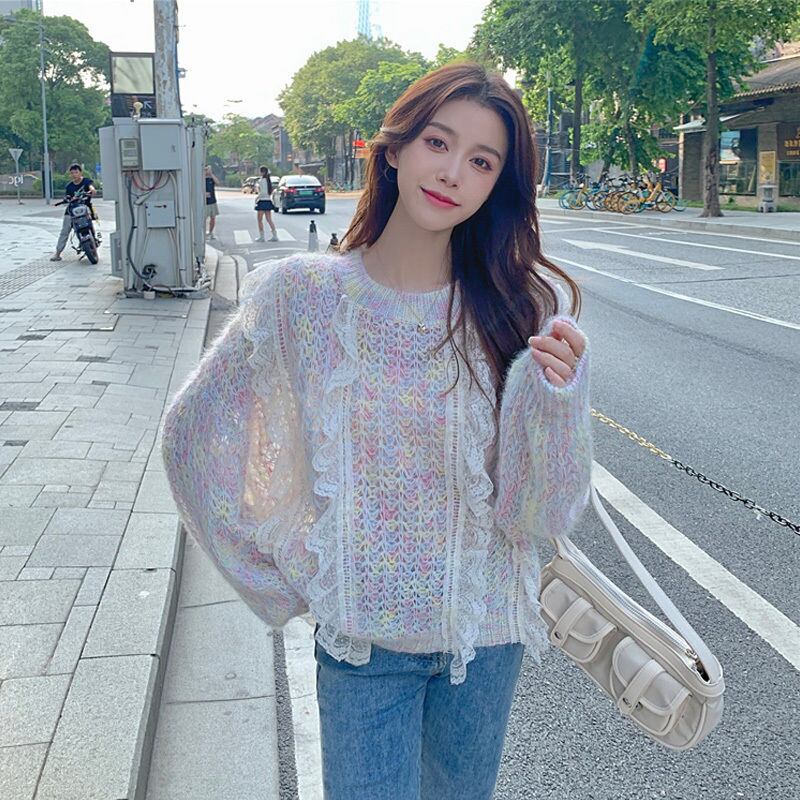 レインボー レース ステッチ セーター トップ レディース 秋冬 ゆったり バージョン レディース セーター 長袖 プルオーバー ロング オータム 秋物 ウィンター 冬物