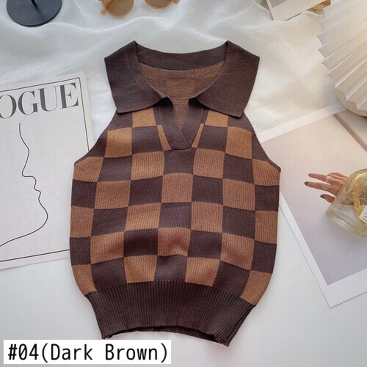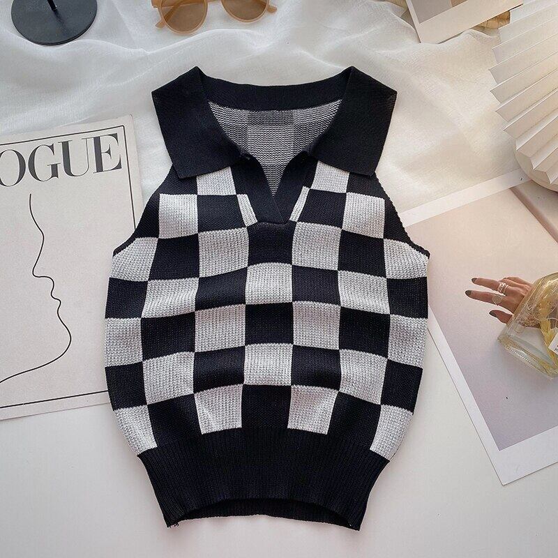 女性の夏 2022 チェック柄タンクトップノースリーブ Tシャツラペルプルオーバーニットチョッキベスト サマー 夏物