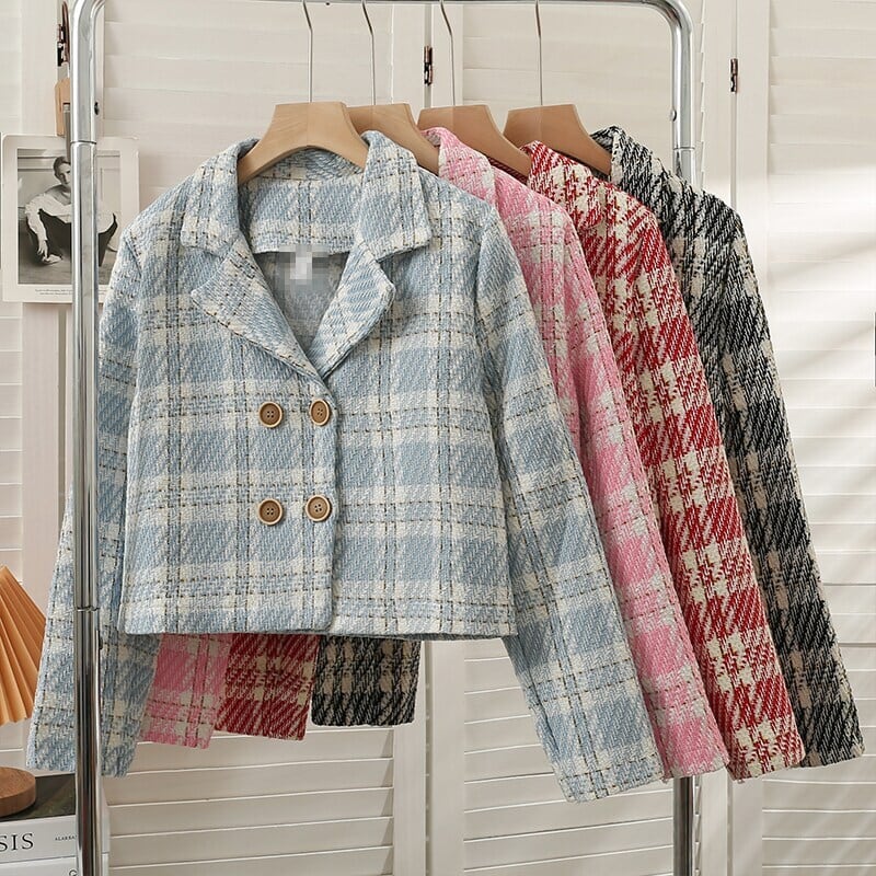 2022 女性春秋のジャケットチェック柄テーラードコート長袖クロップトップレジャーボタンカディガン ロング レッド スプリング 春物 オータム 秋物