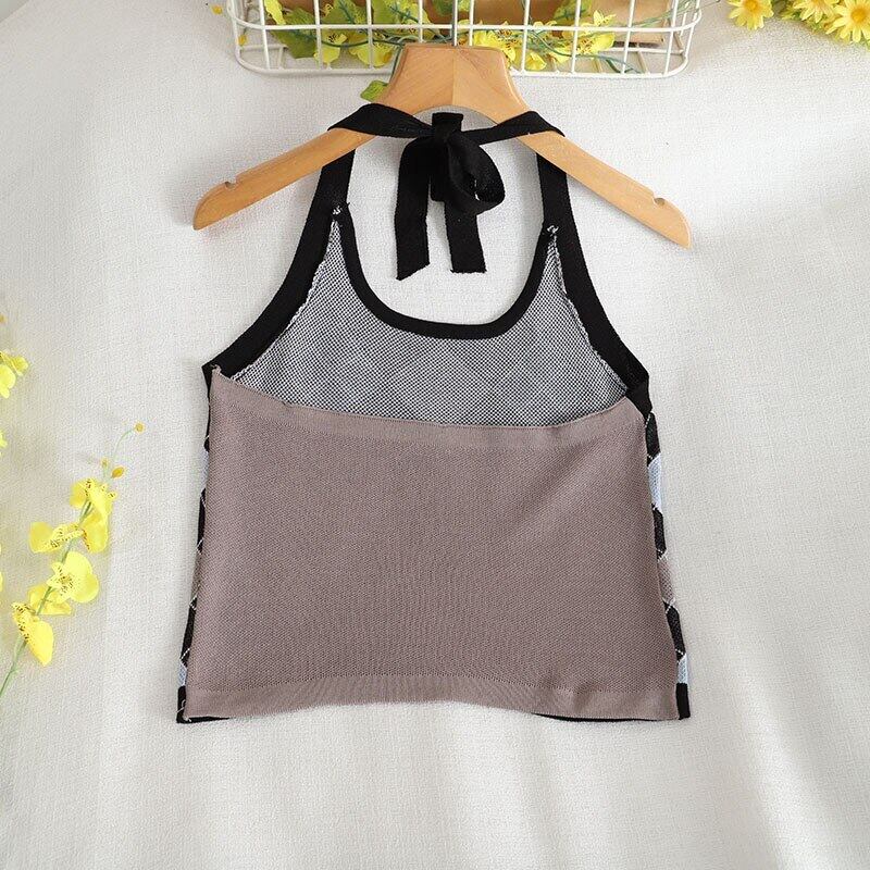 レディース 2022年夏 アーガイル ニット キャミソール ホルタートップ スパゲッティストラップ クロップトップ ノースリーブ キャミソール Y2k 美的 サマー 夏物