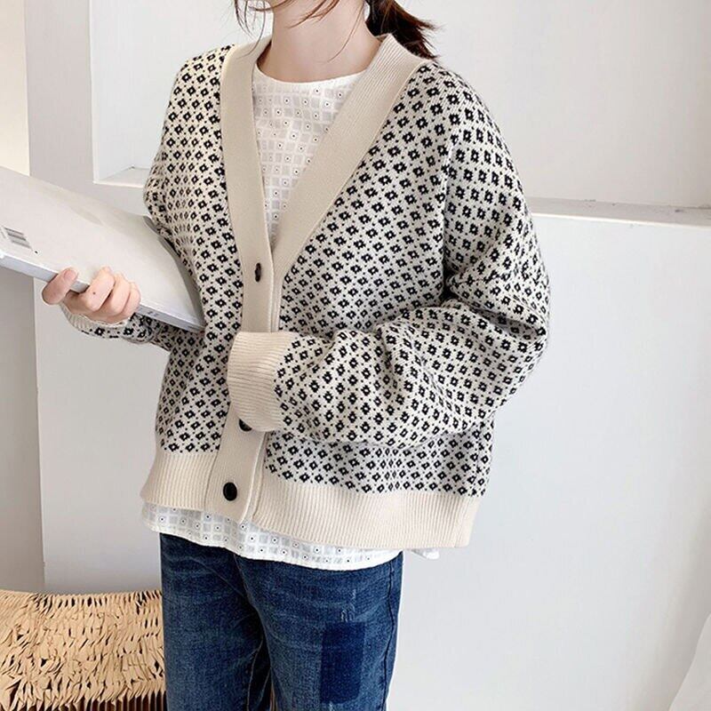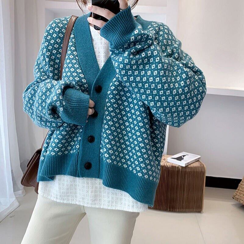 2021 冬のレトロなコントラスト V ネック花柄ボタンカーディガンニットトップ女性ルース長袖厚いセータージャケット ロング ウィンター 冬物 Vネック