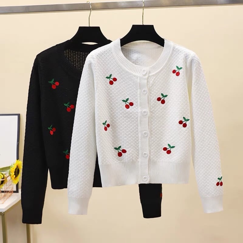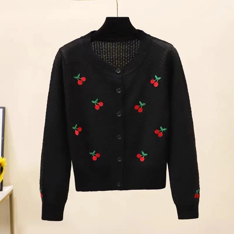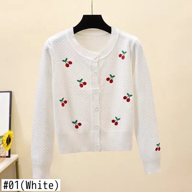 刺繍ブラウス レディース チェリー柄 七分丈 ニット カーディガン ボタン 長袖 トップス ロング レッド