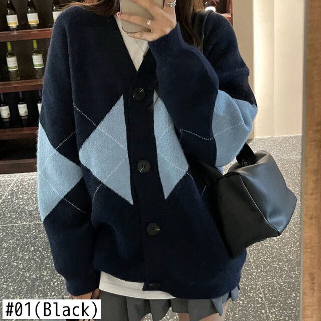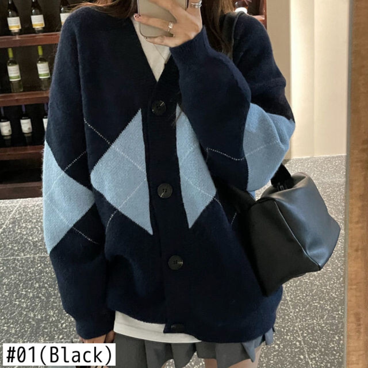 レディース Vネック アーガイル セーター ボタン カーディガン 原宿 超大型 ニット トップス 長袖 厚手 暖かい ゆったり ジャケット コート ロング かわいい
