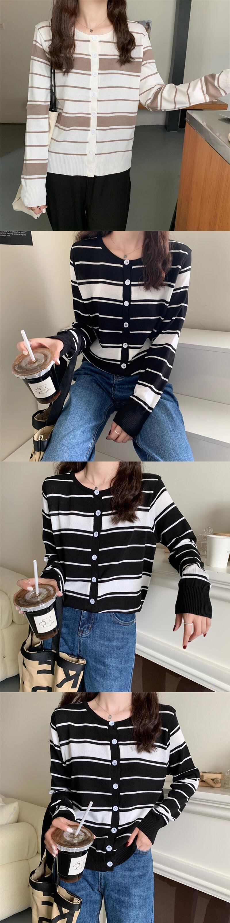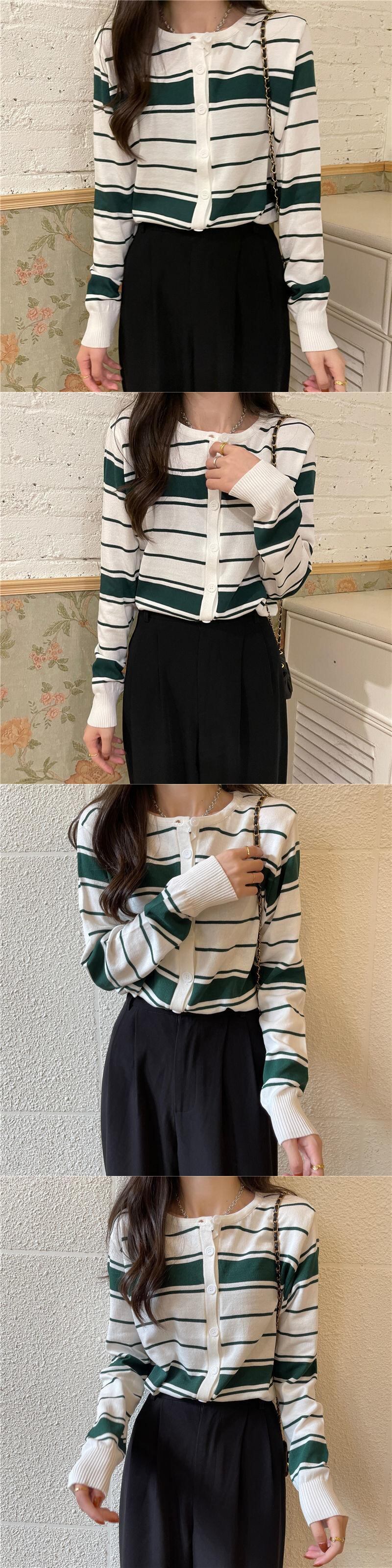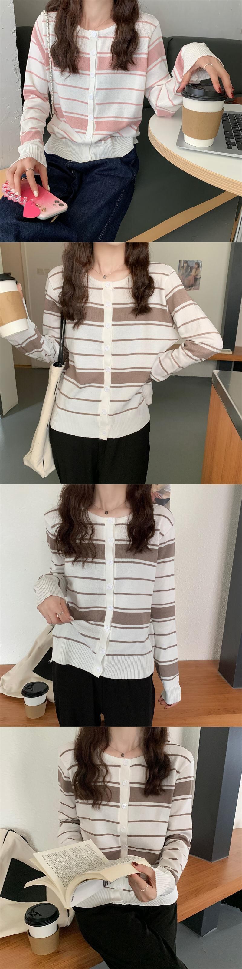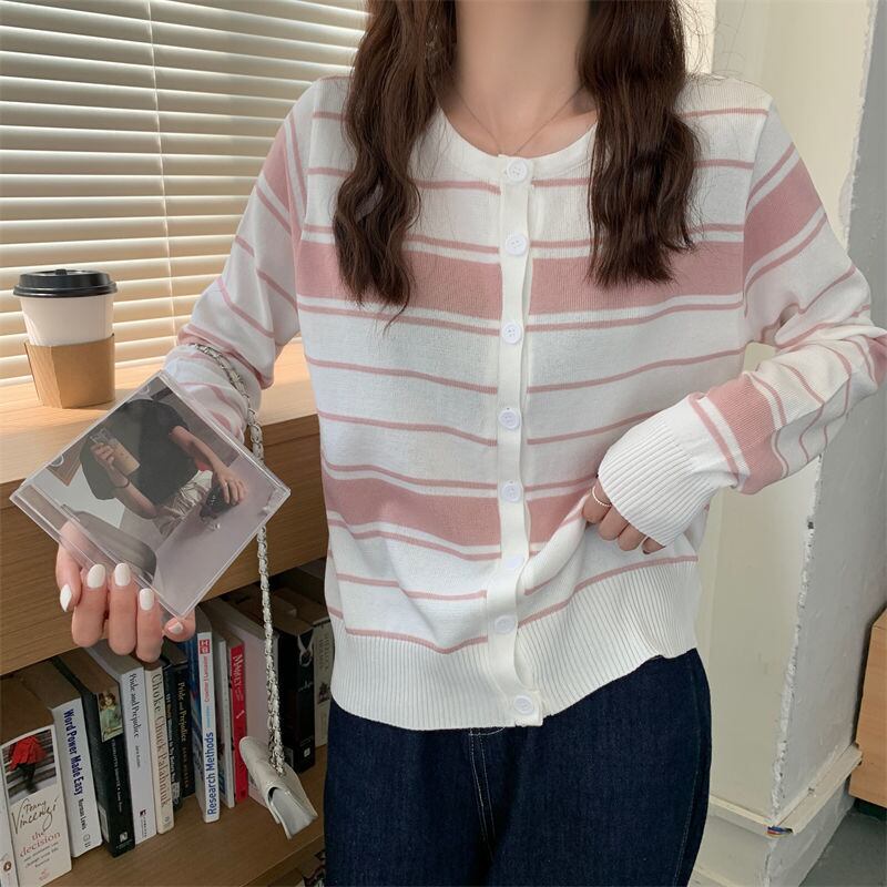 レディース ラウンドネック 長袖 シングルブレスト カーディガン トップス 2021年秋 ルーズ ワイルド ストライプ スリム 薄手 ニット セーター ロング オータム 秋物 Oネック