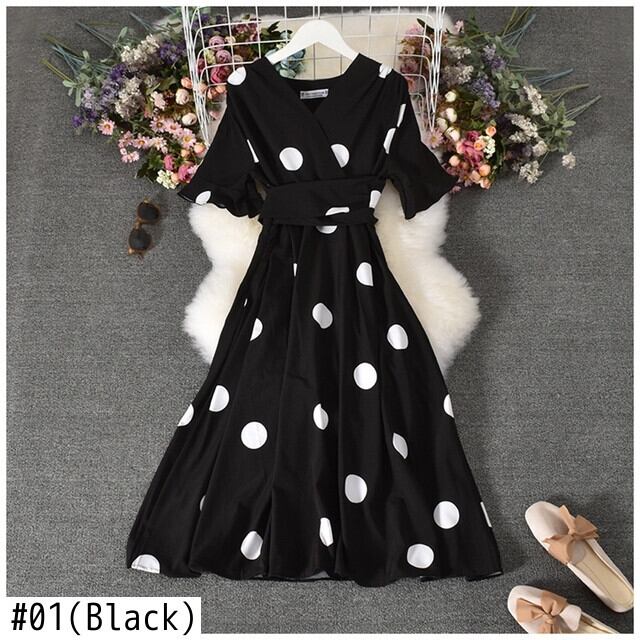 ドレス女性ポルカドットロングフレンチレトロ V ネックドレス包帯ウエスト痩身ドレス服パーティードレス Vネック