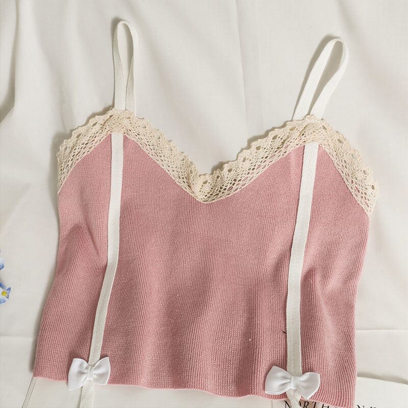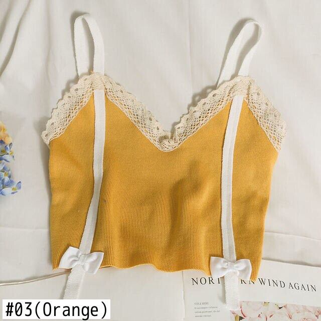 2021 夏の女性のセクシーな V ネックノースリーブ固体弓キャミソールレーストリム装飾クロップドタンク Y2K ニットスポーツストリート Tシャツ リボン サマー 夏物 Vネック ソリッドカラー