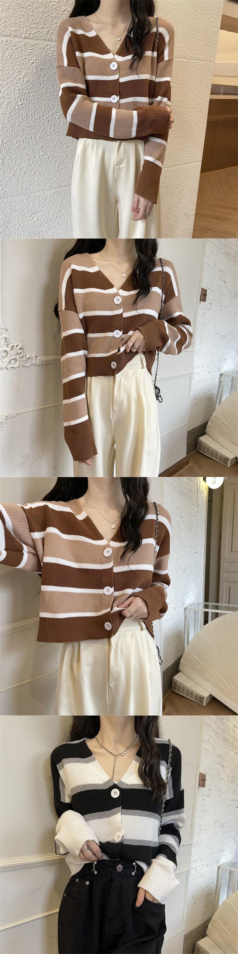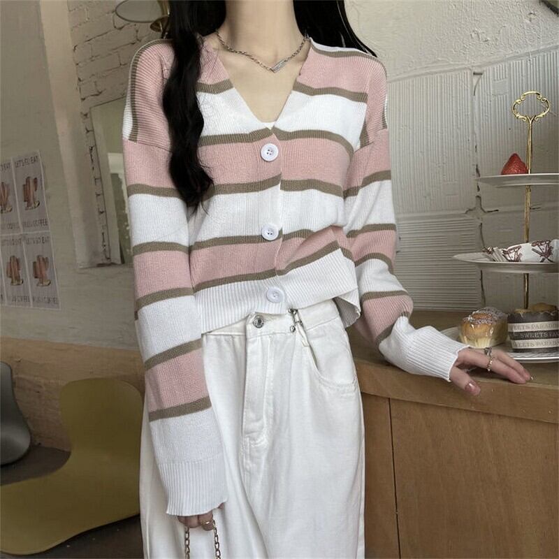 女性の春と秋の 2021 V ネック ストライプ ショート ロング スリーブ セーター コート ese 怠惰で薄いニット カーディガン トップ 長袖 スプリング 春物 オータム 秋物 Vネック