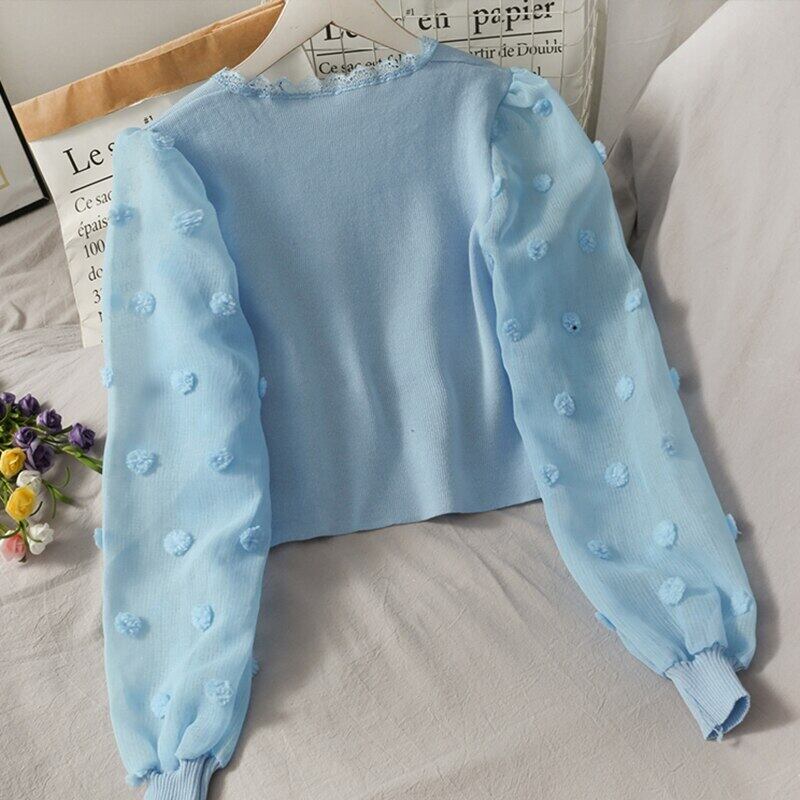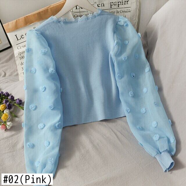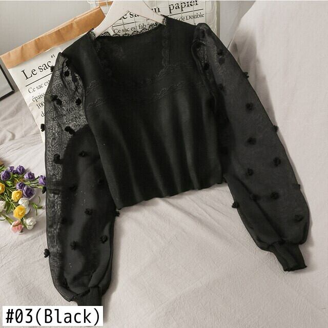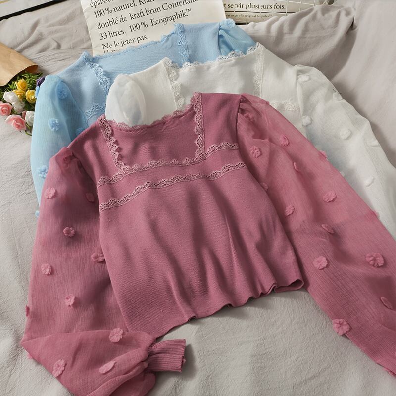 秋 2021 メッシュパッチワークブラウス長袖シャツ女性レーストリムドットパフスリーブトッププルオーバーニットシャツ ロング