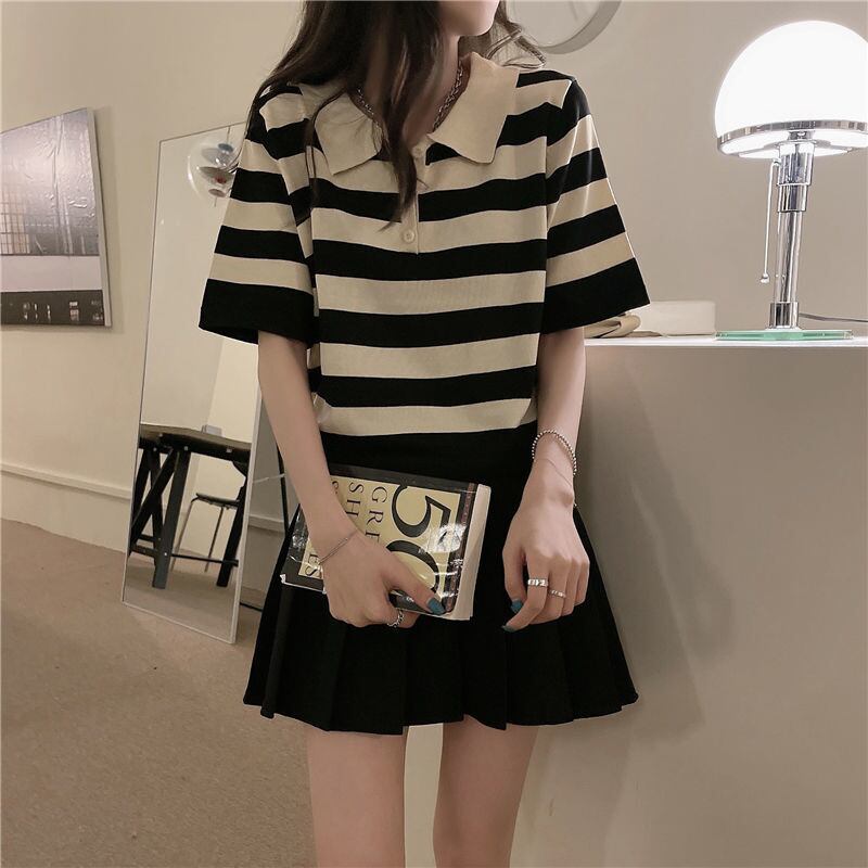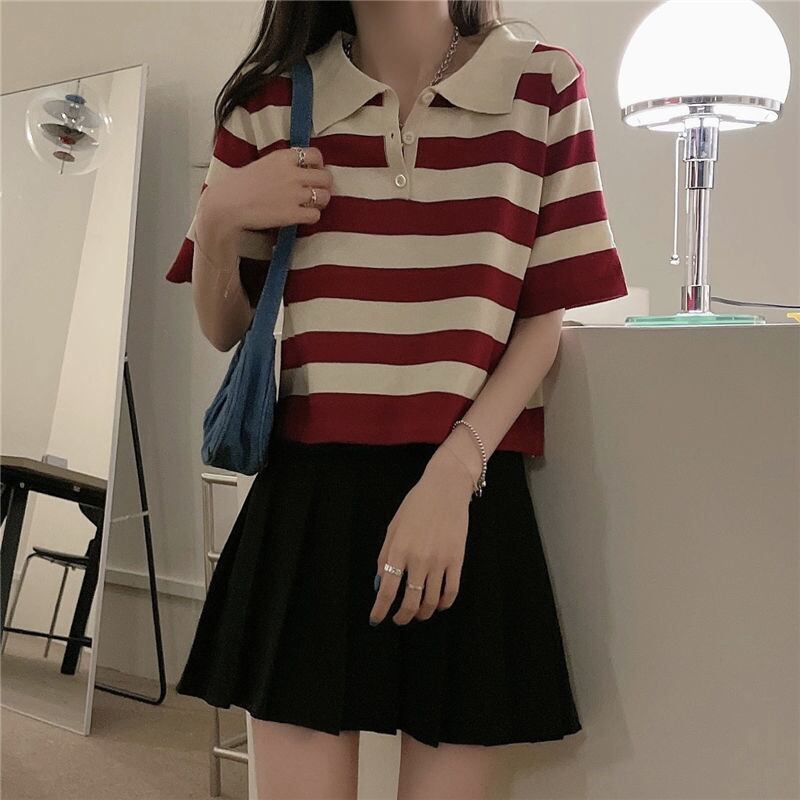 女性の夏の 2021 ポロ ストライプ半袖 T シャツ クロップ トップ T シャツ ショート ハーフスリーブ サマー 夏物 Tシャツ