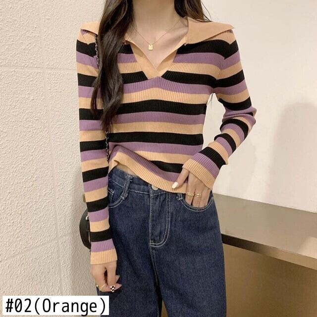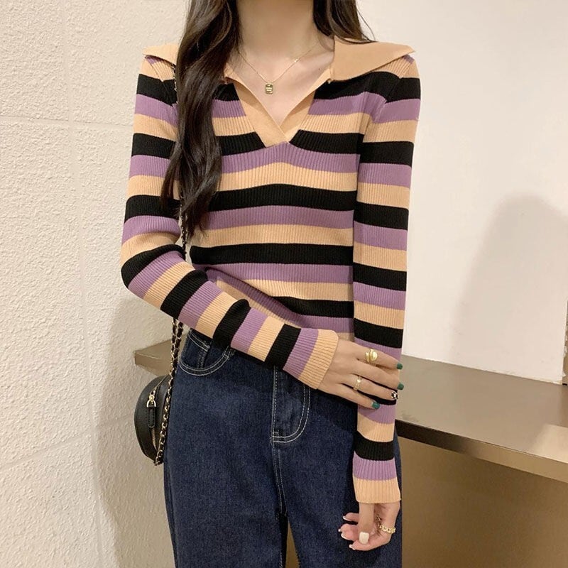 女性のレトロなショート ポロ襟ストライプ コントラスト セーターの伸縮性タイト フィット スリム長袖ボトム シャツ トップ ロング エラスティック