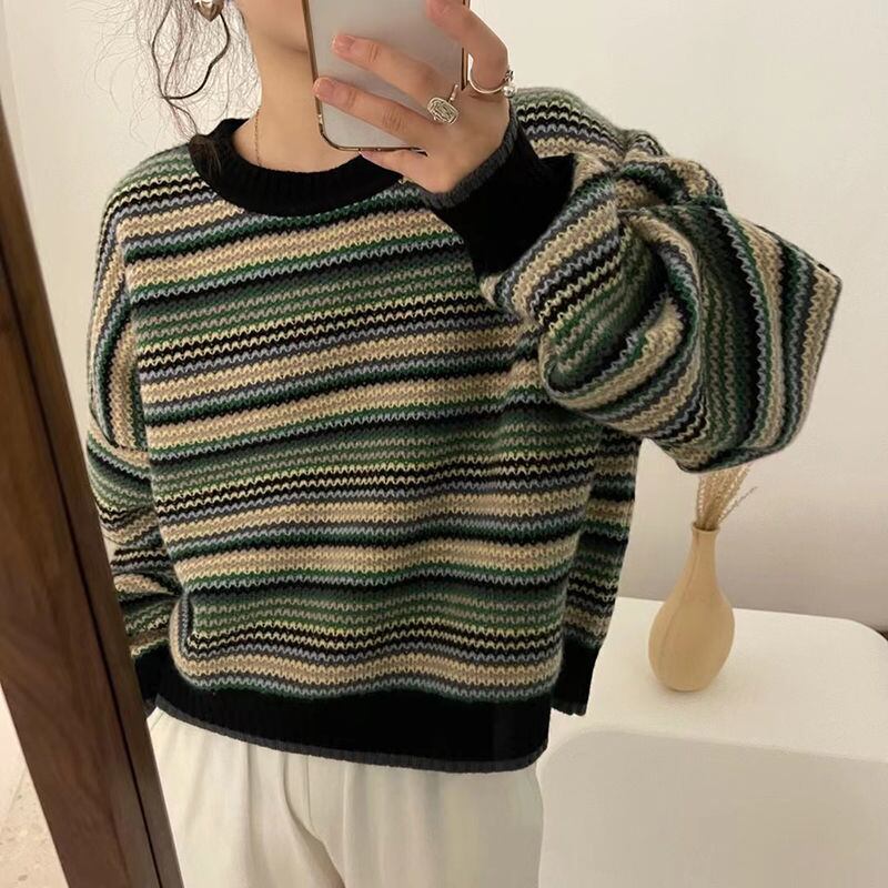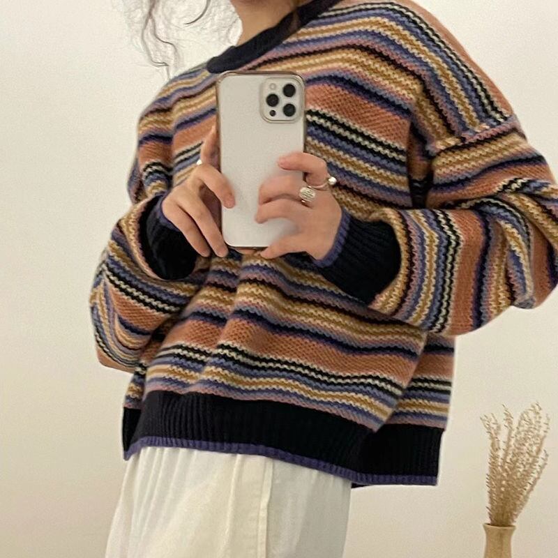ニット底入れシャツ女性の冬ルーズラウンドネック長袖マッチングストライププルオーバーセーターブラウス ロング ウィンター 冬物 Oネック