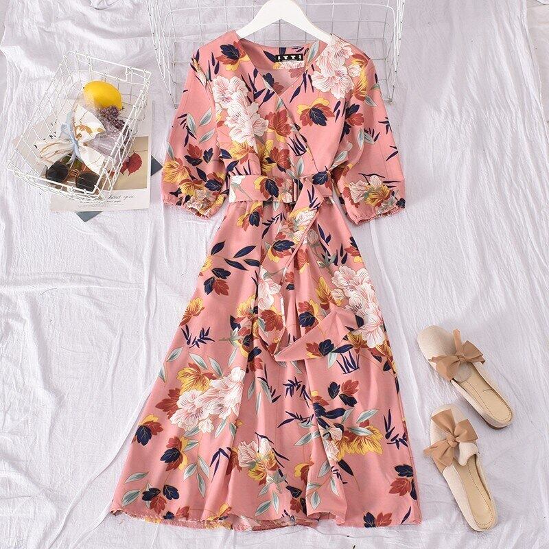 花プリント女性 V ネックアップ半袖滑走路夏サンドレスベルト自由奔放に生きるビーチドレスレトロシックな女性のドレス ショート ハーフスリーブ サマー 夏物 ハーネス Vネック フラワーデザイン