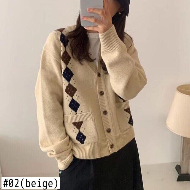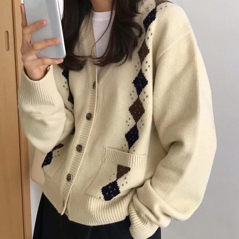 女性のコントラスト スタイル怠惰なルーズ アーガイル セーター ジャケット秋のレトロな V ネック シングル ブレスト ニット カーディガン トップ オータム 秋物 Vネック