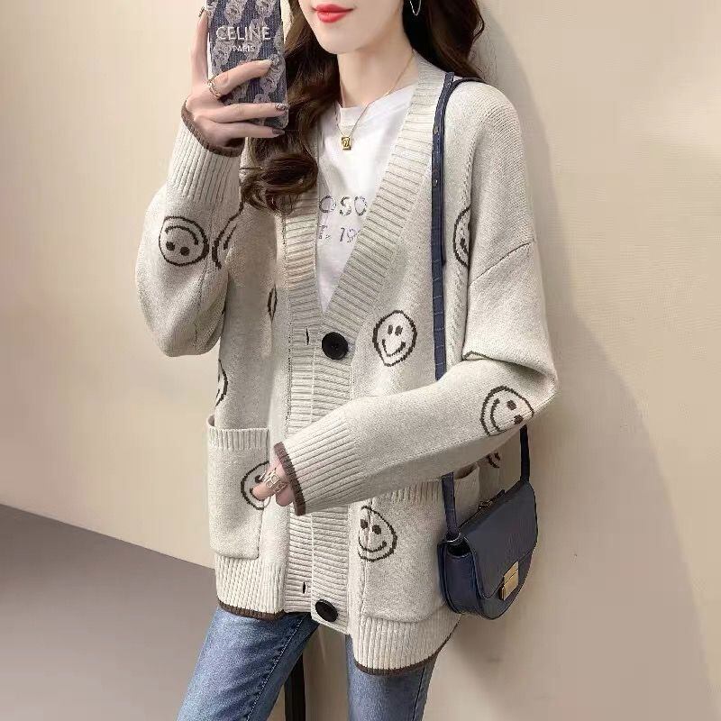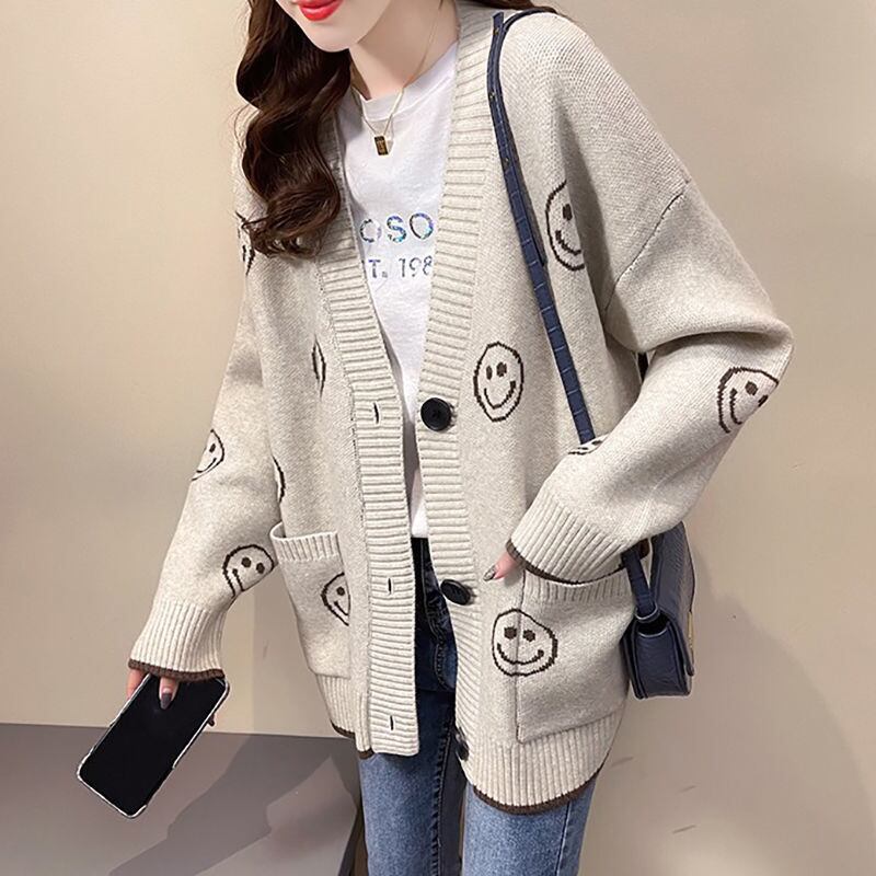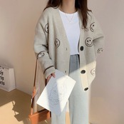 女性の冬暖かいニット セーター スマイリー フェイス プリント怠惰な緩い V ネック シングル ブレスト カーディガン セーター ジャケット ウィンター 冬物 Vネック