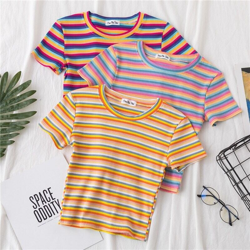 Y2k 美的グラフィック Tシャツ女性ストライプ Tシャツ O ネック半袖クロップトップ Kpop 原宿 Tシャツストリート ショート ハーフスリーブ かわいい Oネック