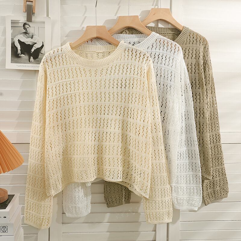 中空アウト長袖トップ女性 2022 ニット Tシャツブラウスルーズ日焼け止めシャツストリート ロング