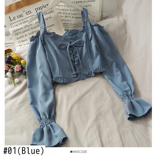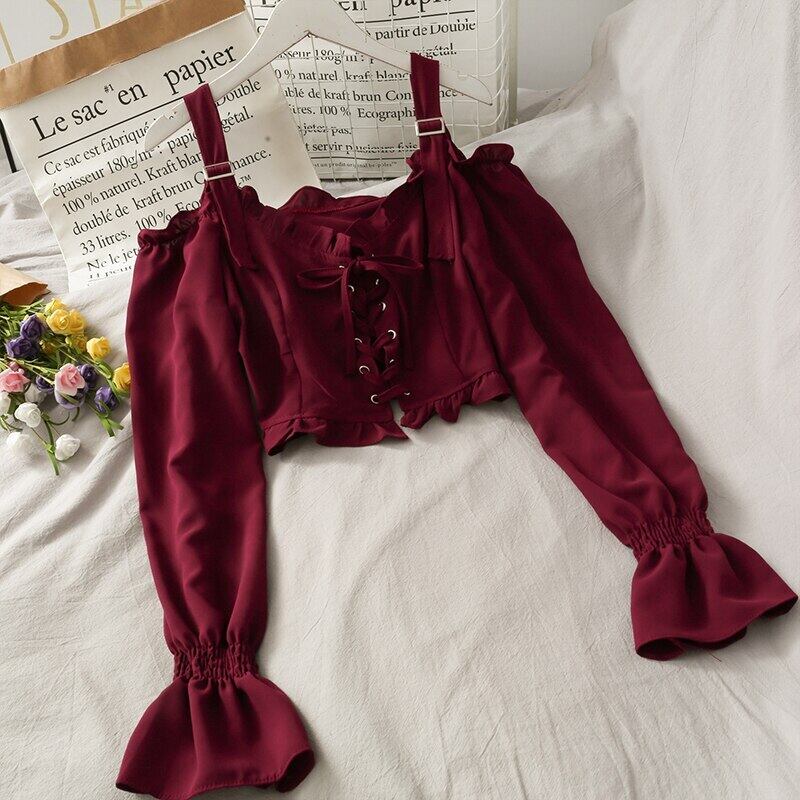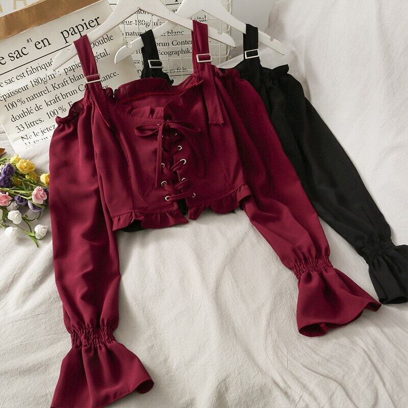 女性ブラウス 2021 シックなフレンチ包帯オフショルダーフリルトップ長袖シャツ Y2k 美的ストリート ロング