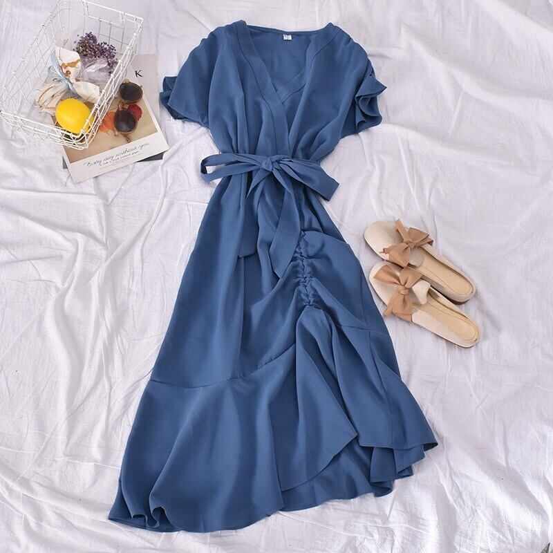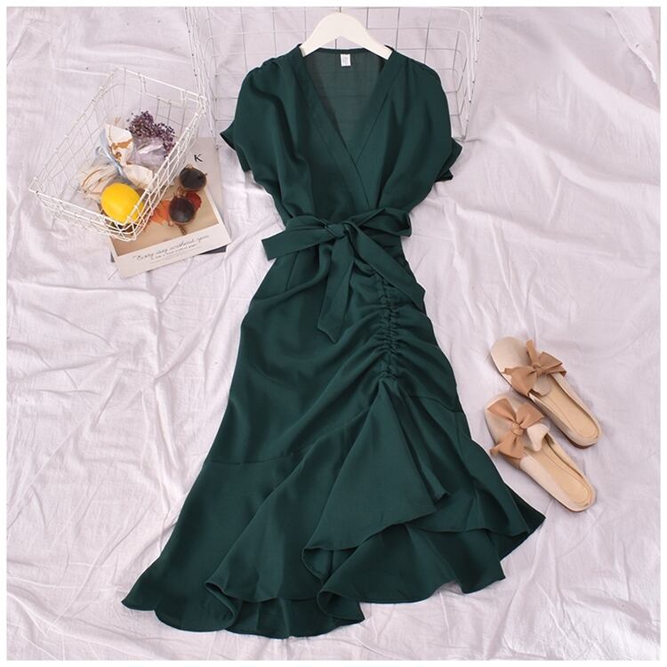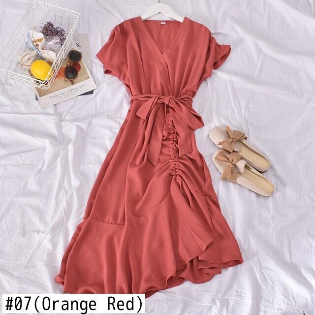 半袖 無地 無地 フリル プリーツ ロングスカート イレギュラーヘム 2021年スタイル Vネック ミドル丈ワンピース ソリッドカラー