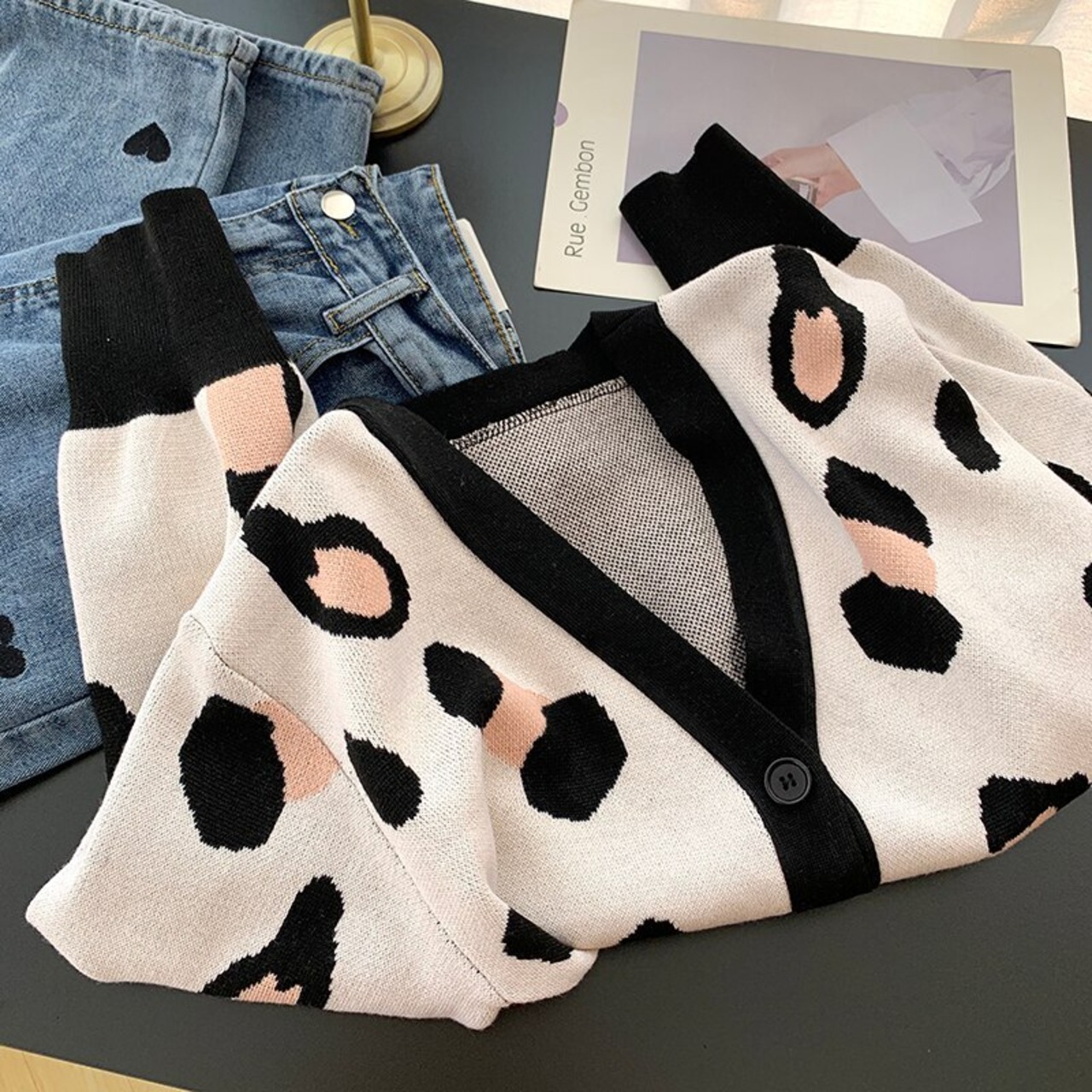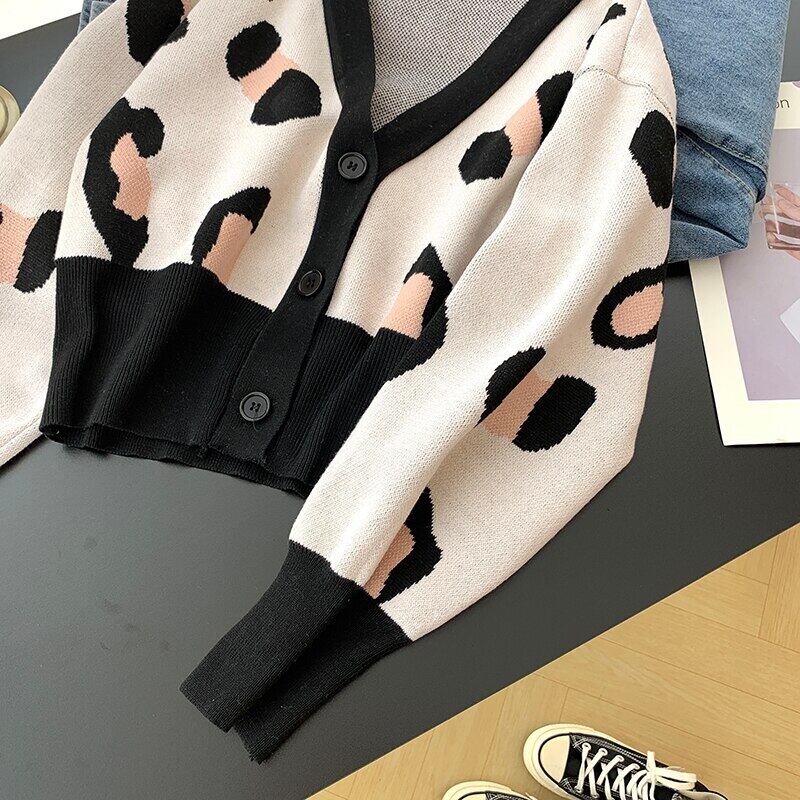秋 2021 V ネックボタンヒョウニットカーディガン長袖トップ女性パッチワーククロップドセータージャンパーストリート ロング Vネック