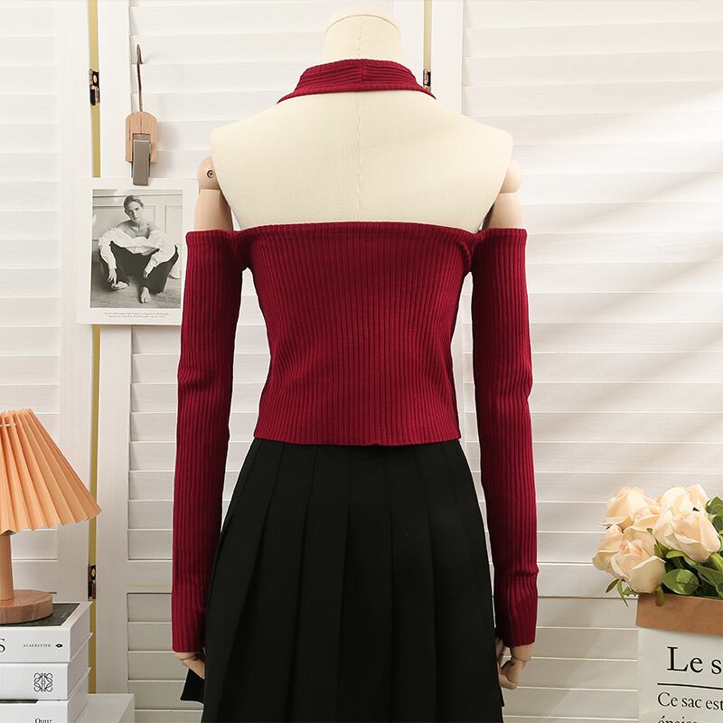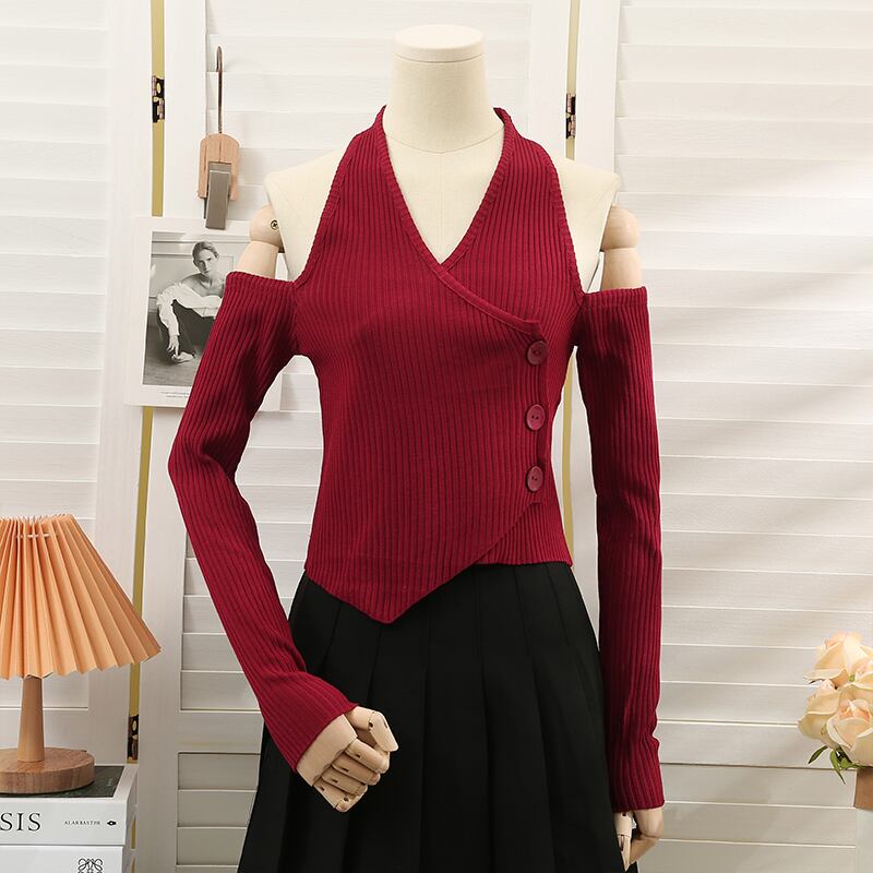 フランスオフショルダー長袖ストリート女性 Tシャツスリムニットブラウススキニー Tシャツ Y2k 美的服トップ ロング