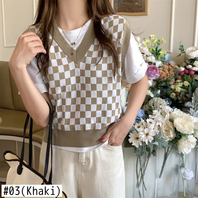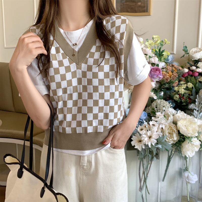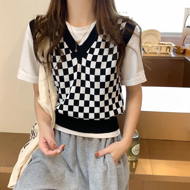女性チェック柄原宿ストリート V ネックノースリーブセーターベスト学生プレッピースタイル Y2k ルーズニット かわいい Vネック