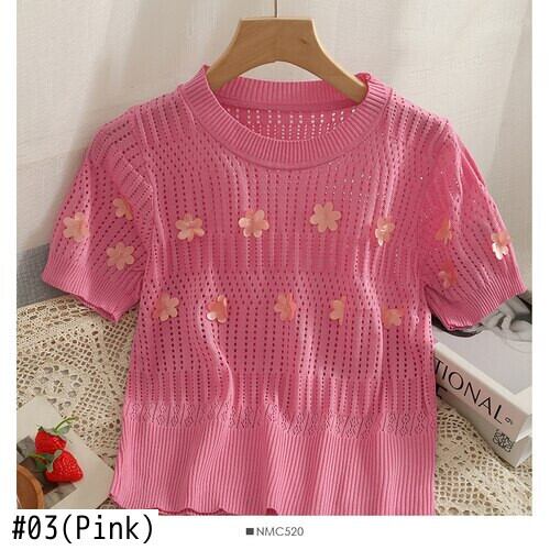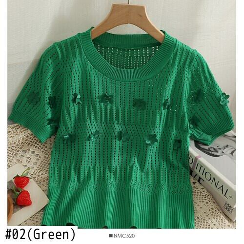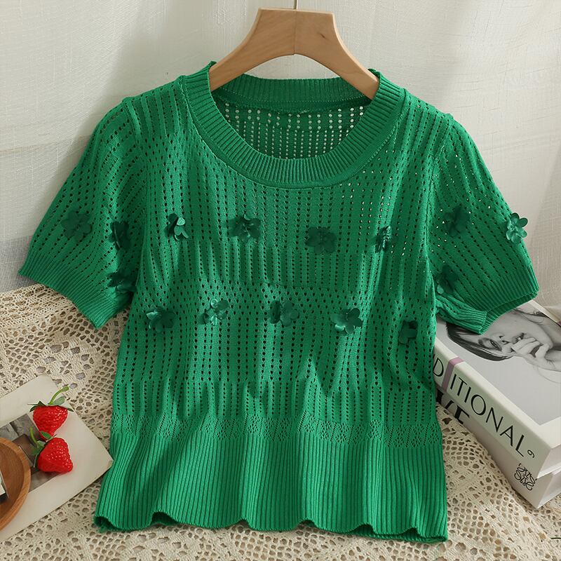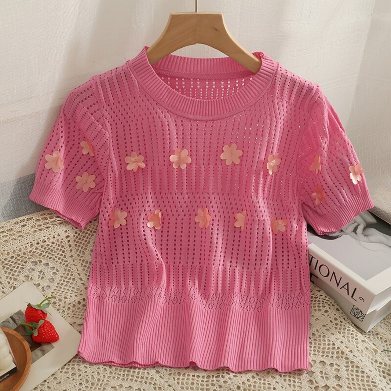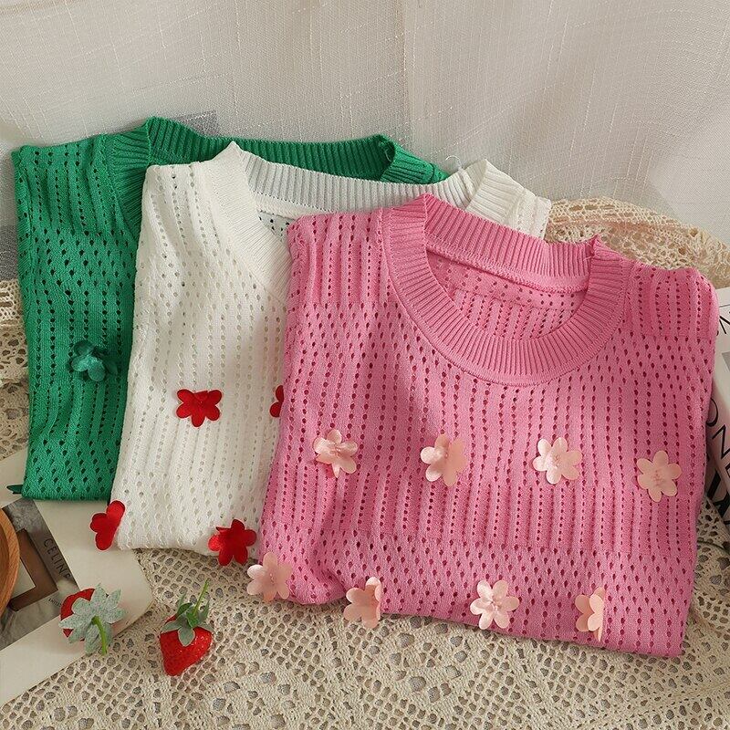2022 夏中空薄型ニット Tシャツ女性の Y2k ステレオフラワーシャツ半袖 Tシャツブラウストップス ショート ハーフスリーブ サマー 夏物 フラワーデザイン
