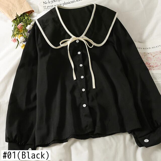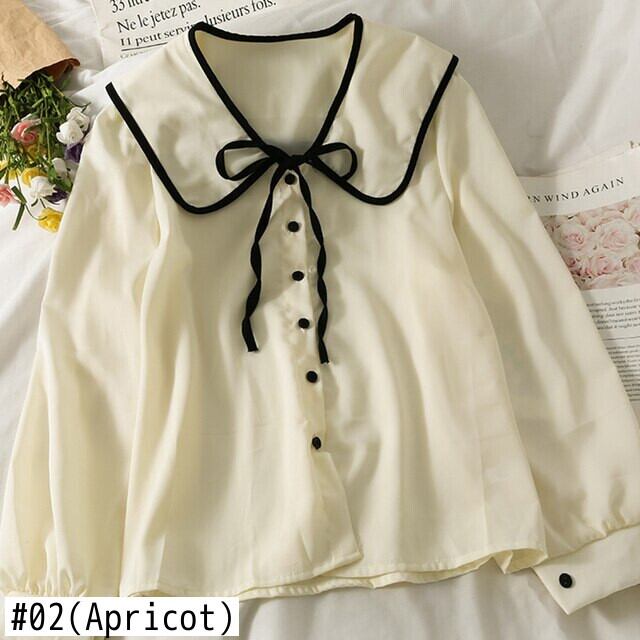 スタイル弓ピーターパン襟ボタンアップシャツ女性春秋シングルブレスト長袖トップ ロング リボン スプリング 春物 オータム 秋物