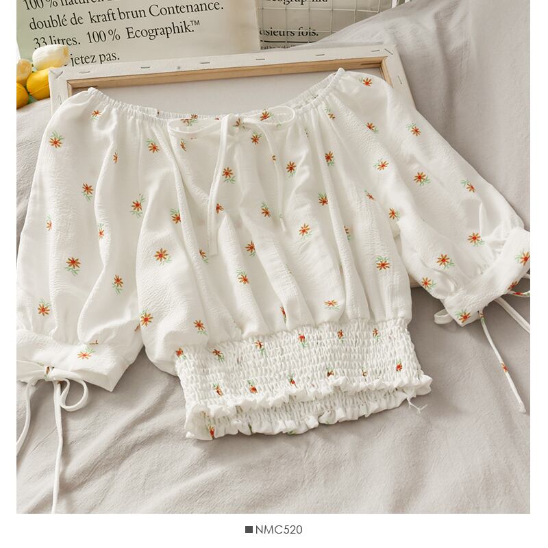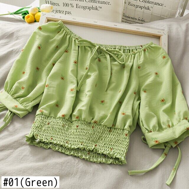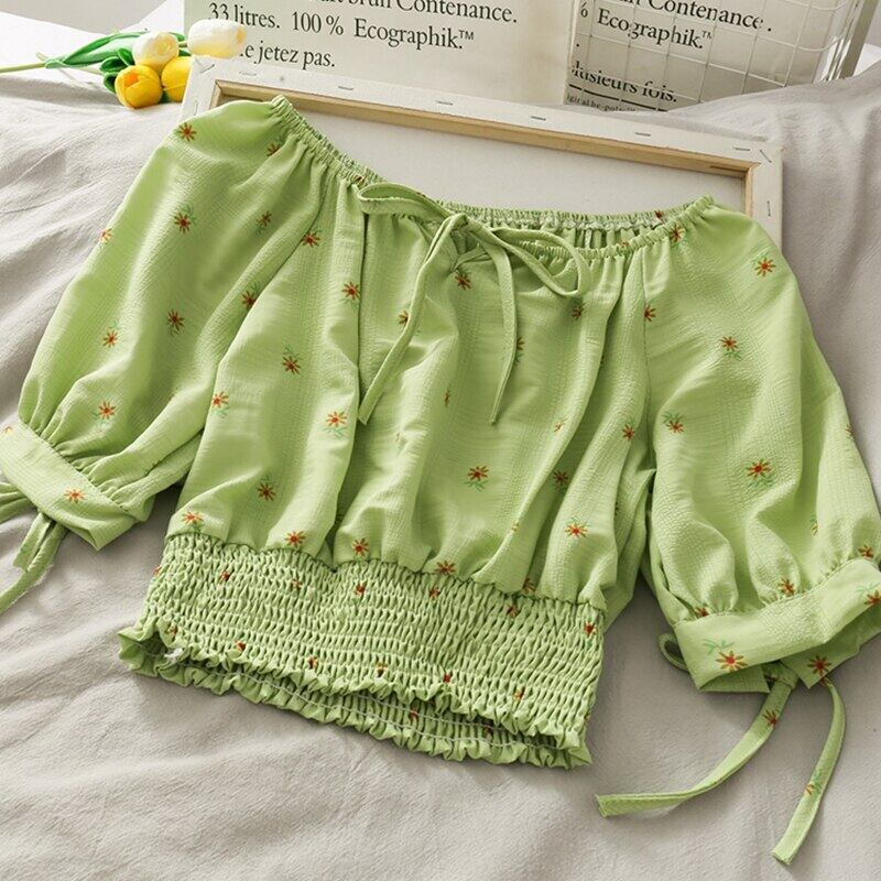 女性ブラウス 2021 フレンチチュニッククロップトップ花柄半袖 Tシャツシックな弓 Y2k ストリート ショート リボン ハーフスリーブ