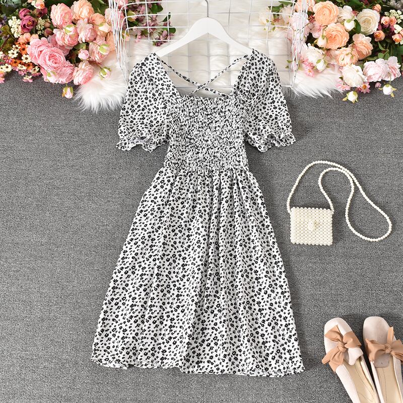 フローラル プリント シフォン ミディ ドレス女性の夏のスクエア カラー パフ スリーブ A ライン パーティー セクシーな背中の開いたひだスリム自由奔放に生きるドレス サマー 夏物 花柄 Aライン スクウェア