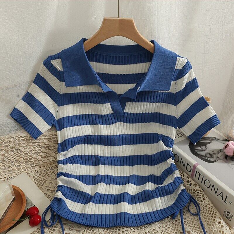 巾着 ニット Tシャツ レディース サマー ストライプ スリム ラペル シャツ クロップトップ Y2k 半袖 ポロシャツ Ropa ショート ハーフスリーブ 夏物