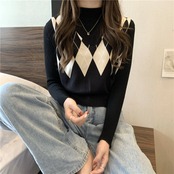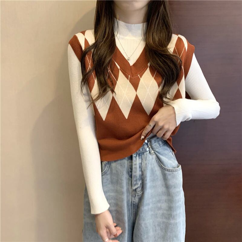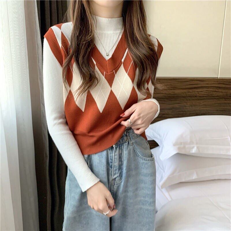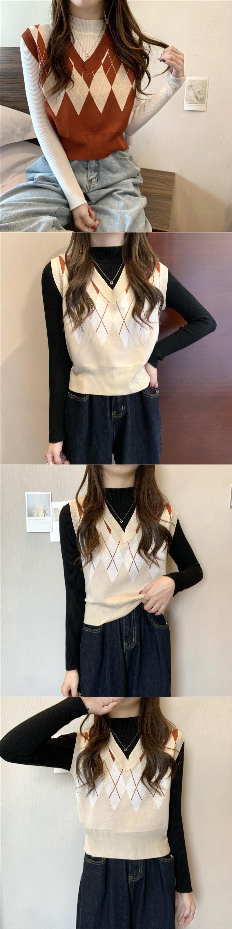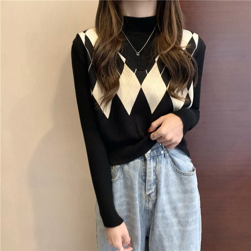 アーガイルセーターベスト女性黒ノースリーブチェック柄ニットクロップセーター秋のプレッピースタイル秋 2021 トップス V ネック ブラック オータム 秋物 Vネック