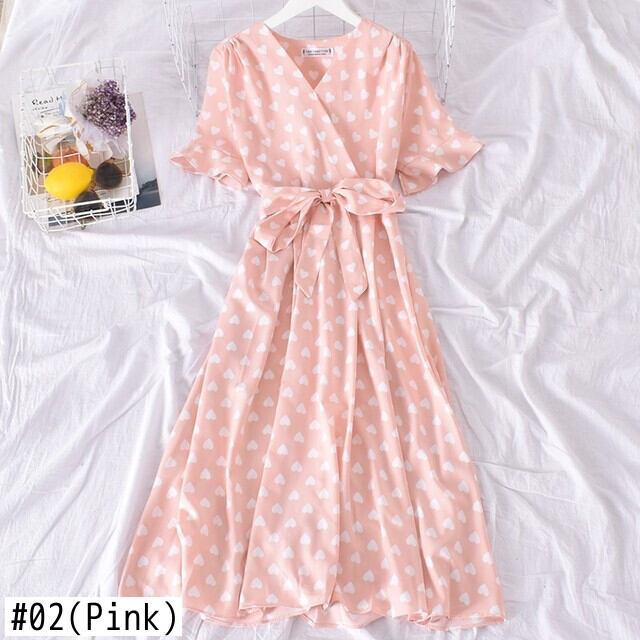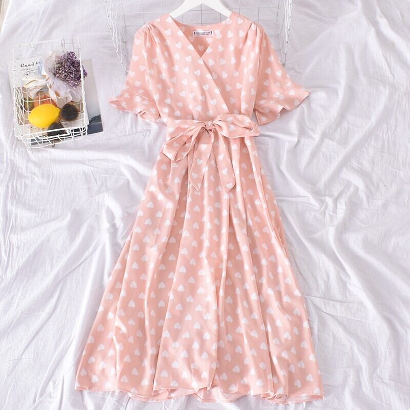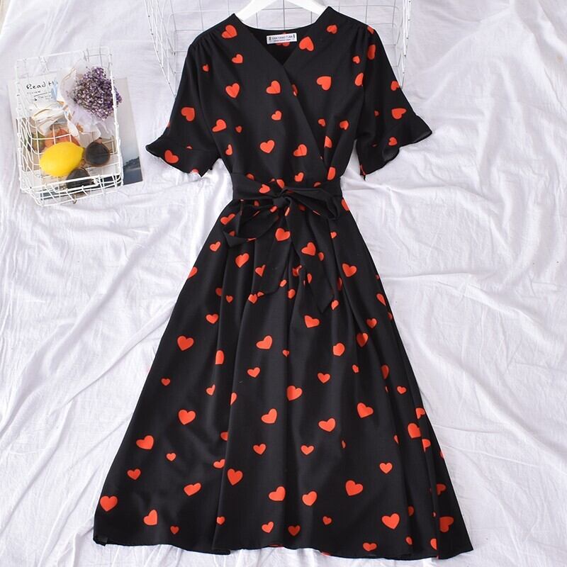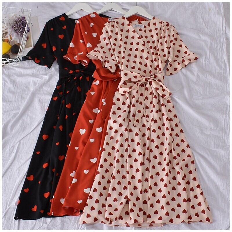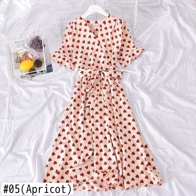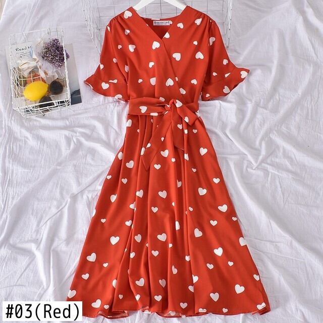 甘くて優しい風ドレス 2021 夏スタイル V ネック半袖スリム ミドル丈ハート型プリント スリム ドレス女性 ショート ハーフスリーブ 大人ガーリー スウィート キュート カジュアル サマー 夏物 Vネック