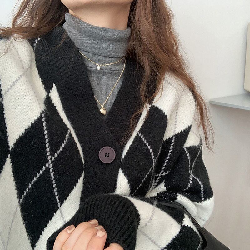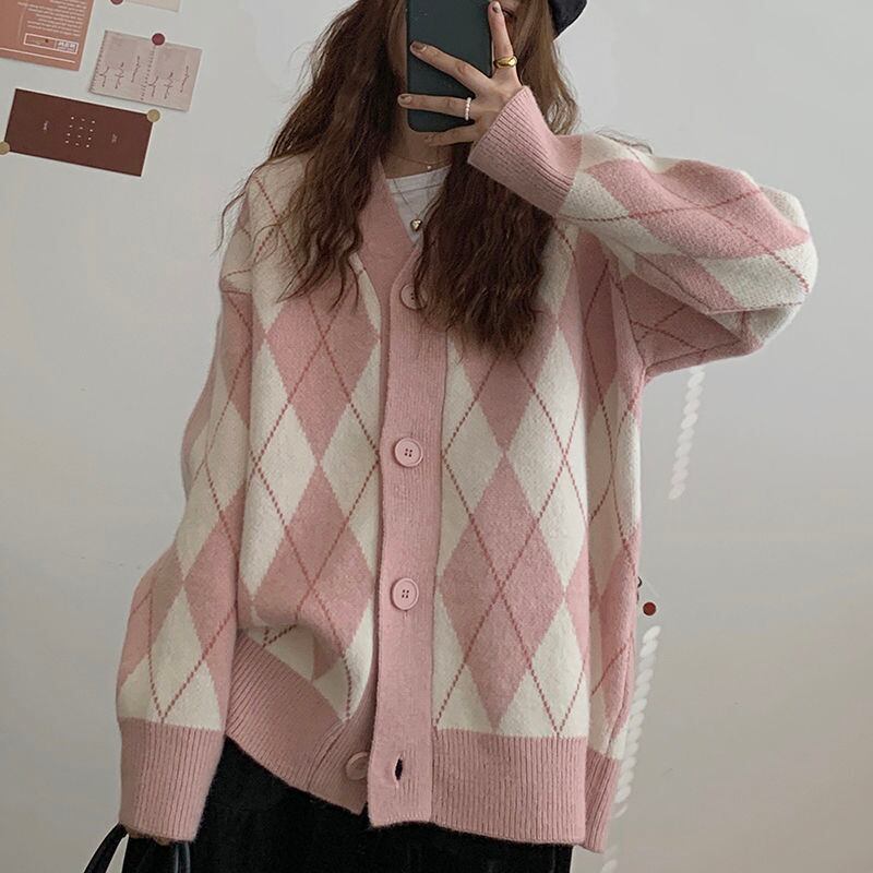 女性アーガイルカーディガンニットセータールーズシングルブレスト V ネック長袖ニットオーバーサイズカーディガン冬のジャケット ロング ウィンター 冬物 Vネック
