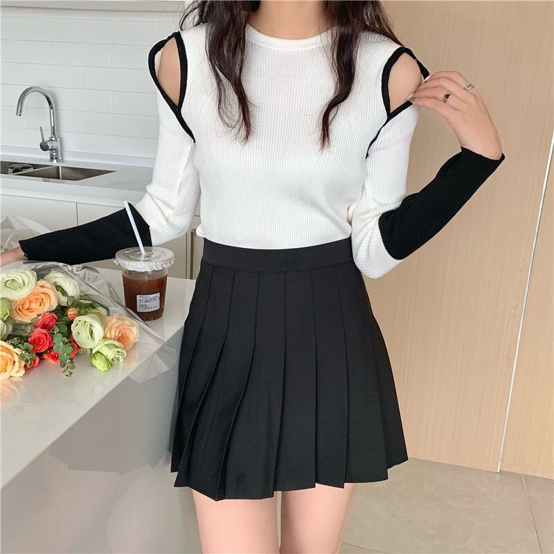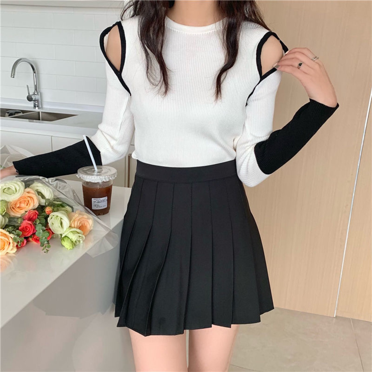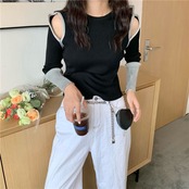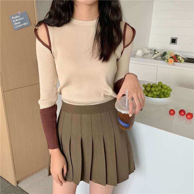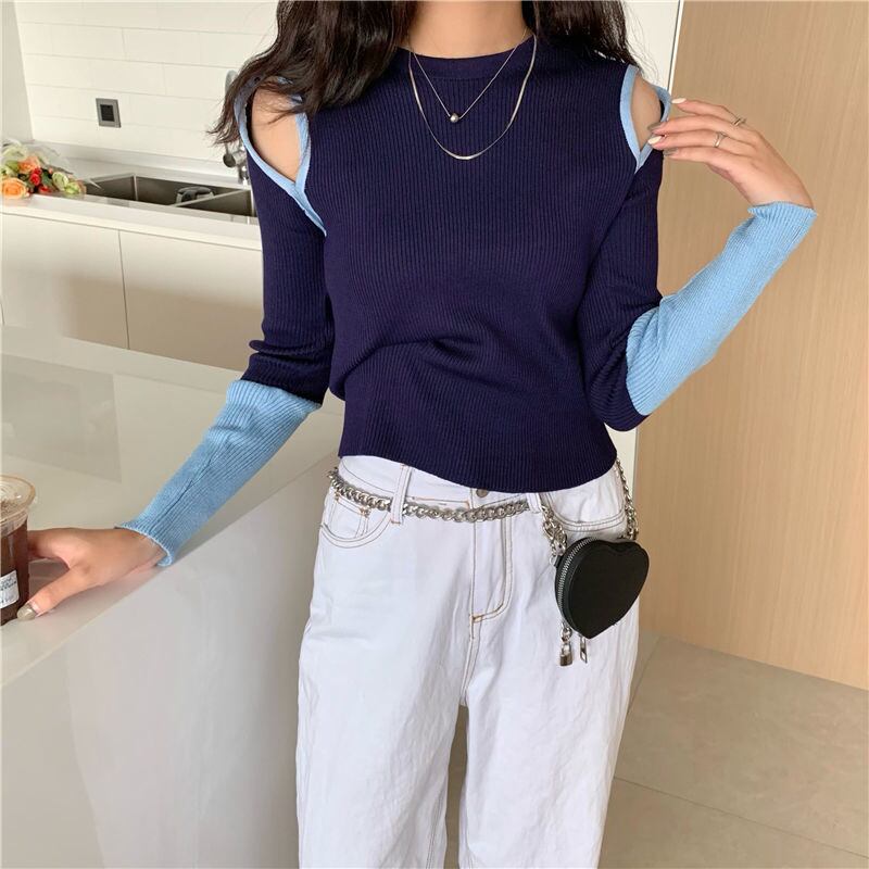 レディース 秋 ステッチ コントラスト オフショルダー 長袖 ニットトップ フレンチホロウ セクシー シック アウター ボトムス シャツ ロング オータム 秋物