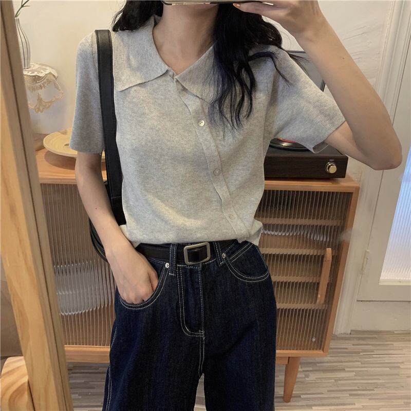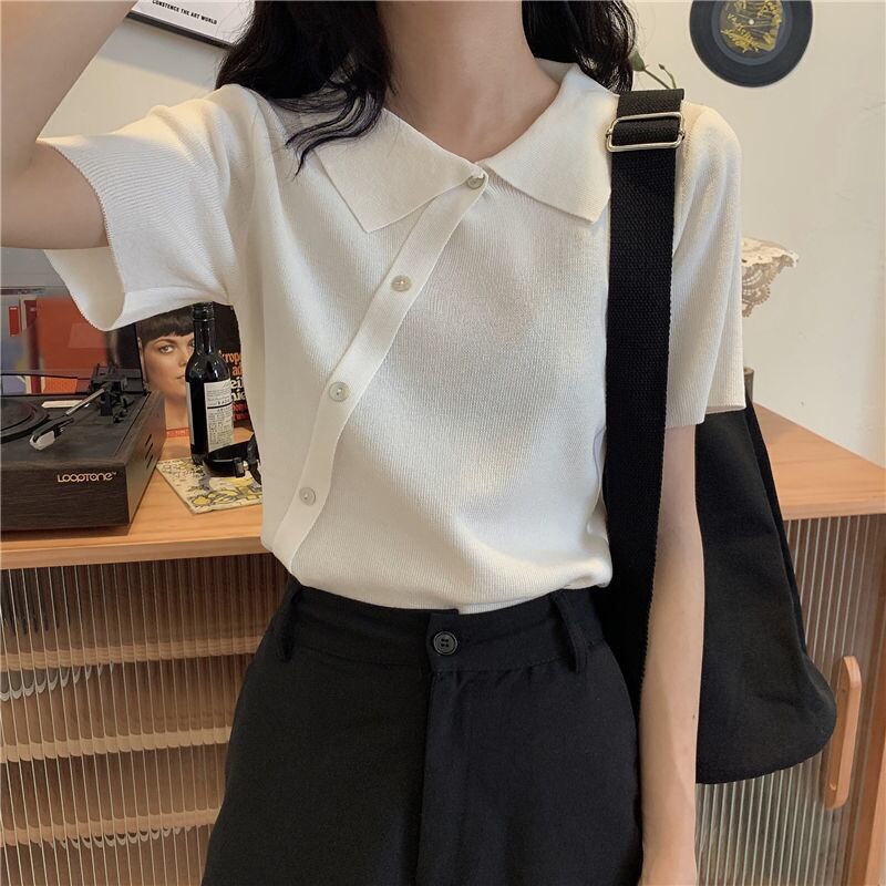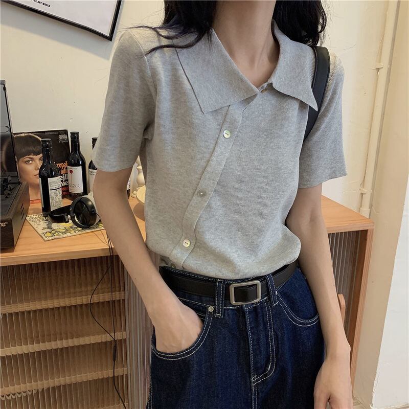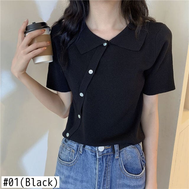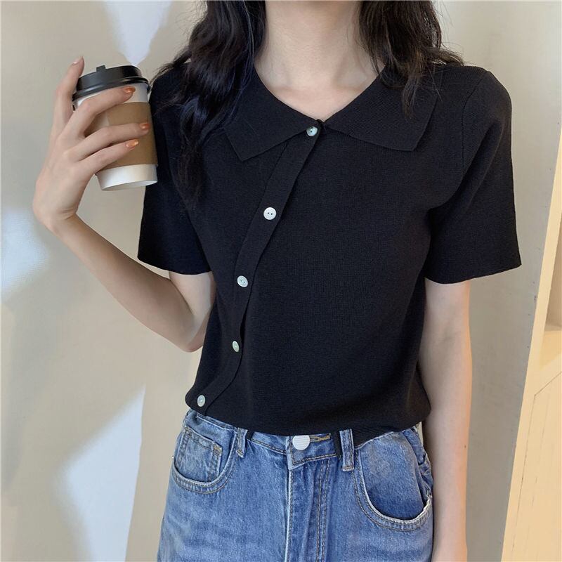 レディース Tシャツ 2021 ポロ 半袖 イレギュラーボタン クロップトップ ニット Tシャツ ストリート ショート ハーフスリーブ