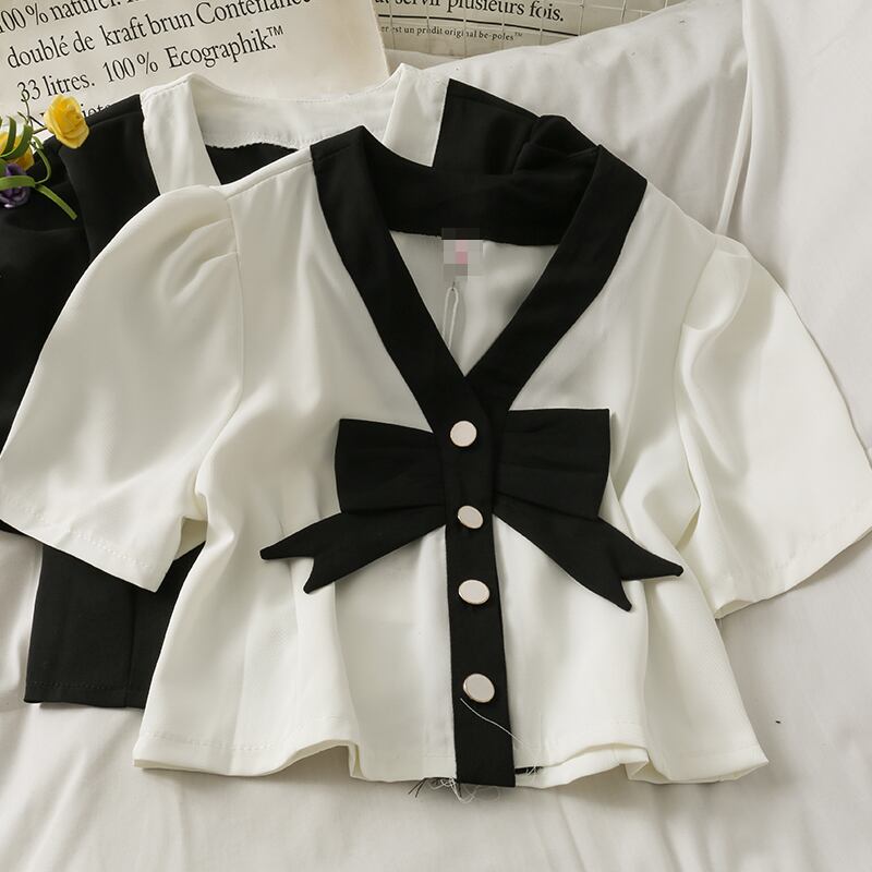 女性ブラウス 2021 夏パッチワークボウシャツ半袖クロップトップ女性のブラウス Y2k 美的 ショート リボン ハーフスリーブ サマー 夏物
