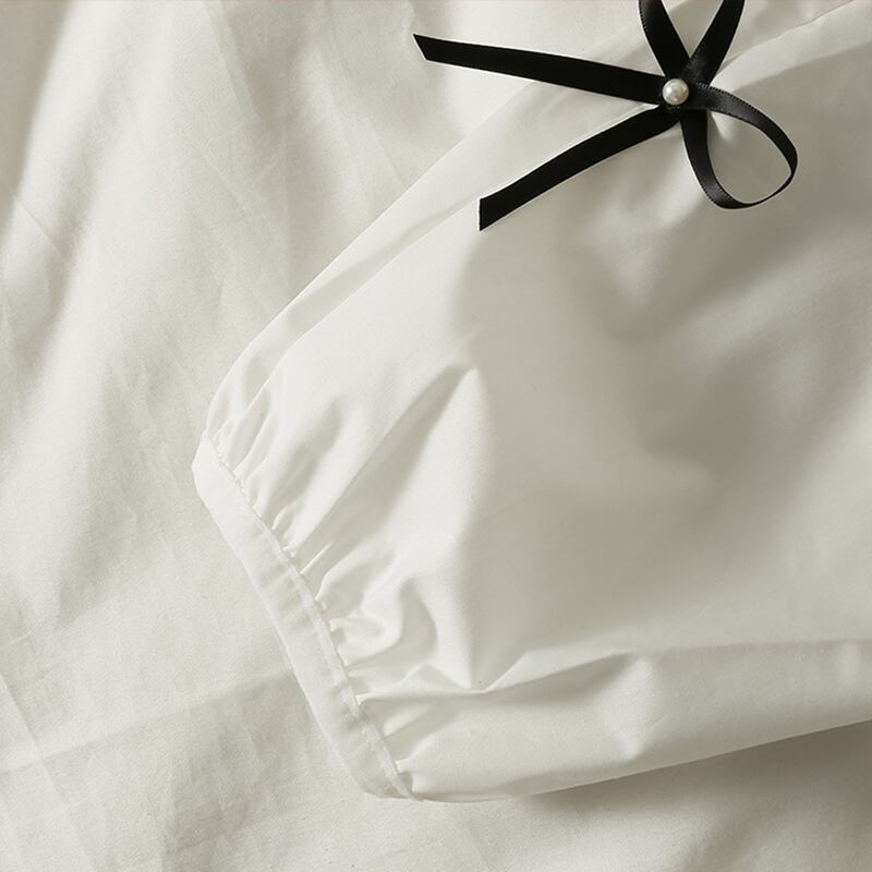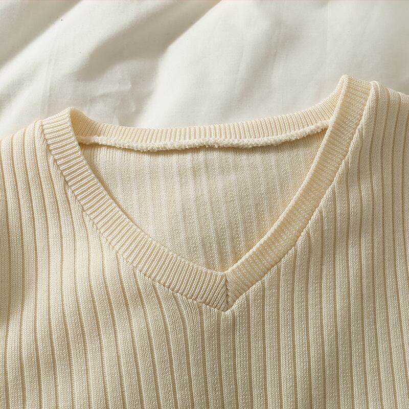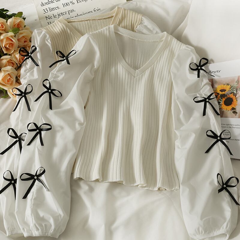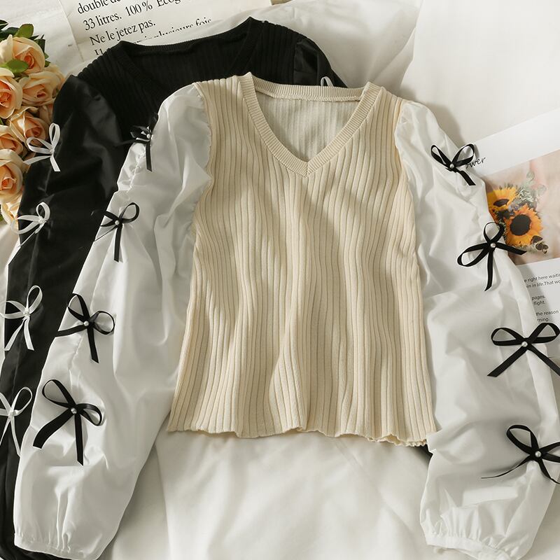 2021年秋カラーコントラストパッチワークボウパフスリーブトップレディースVネックロングスリーブTシャツスリムセーターニットブラウスTシャツ リボン 長袖