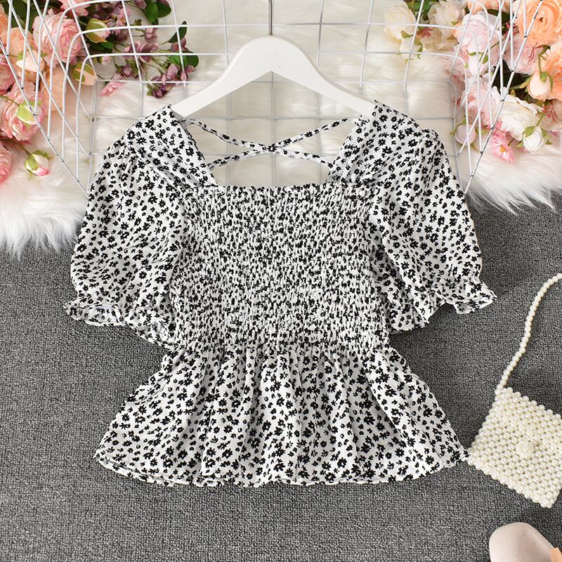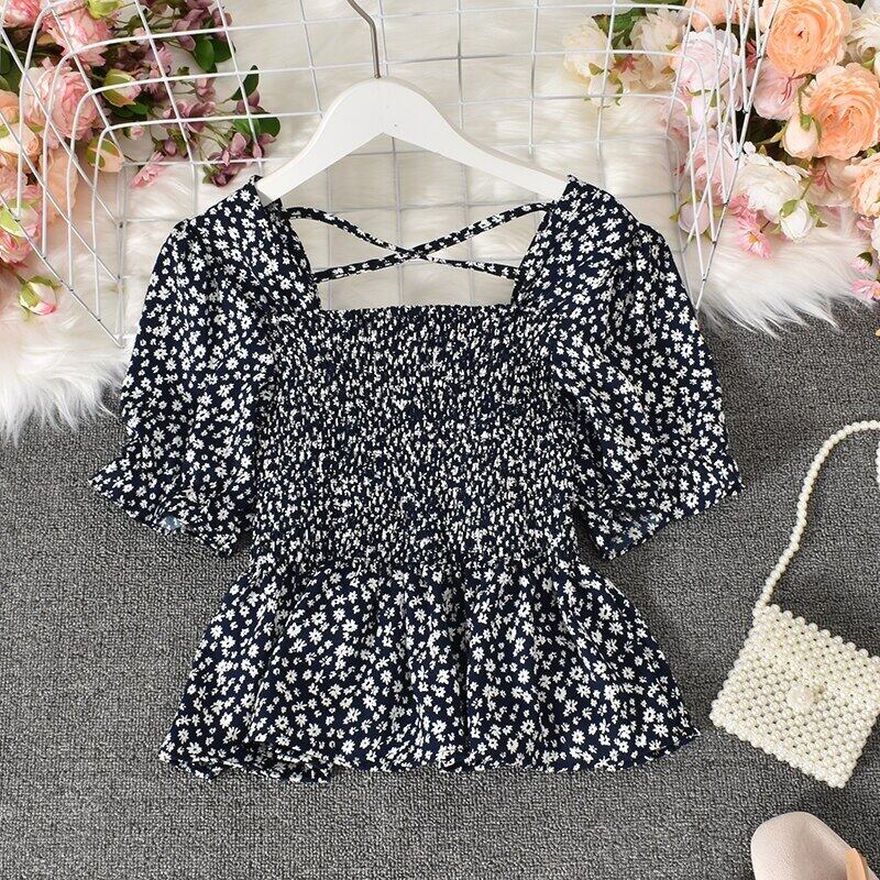 セクシーな女性の背中の開いたシャツブラウススウィートパフスリーブ裾プリーツフリルショートシャツ花柄スリムスクエアカラートップスストリート ラッフル 大人ガーリー キュート カジュアル スクウェア