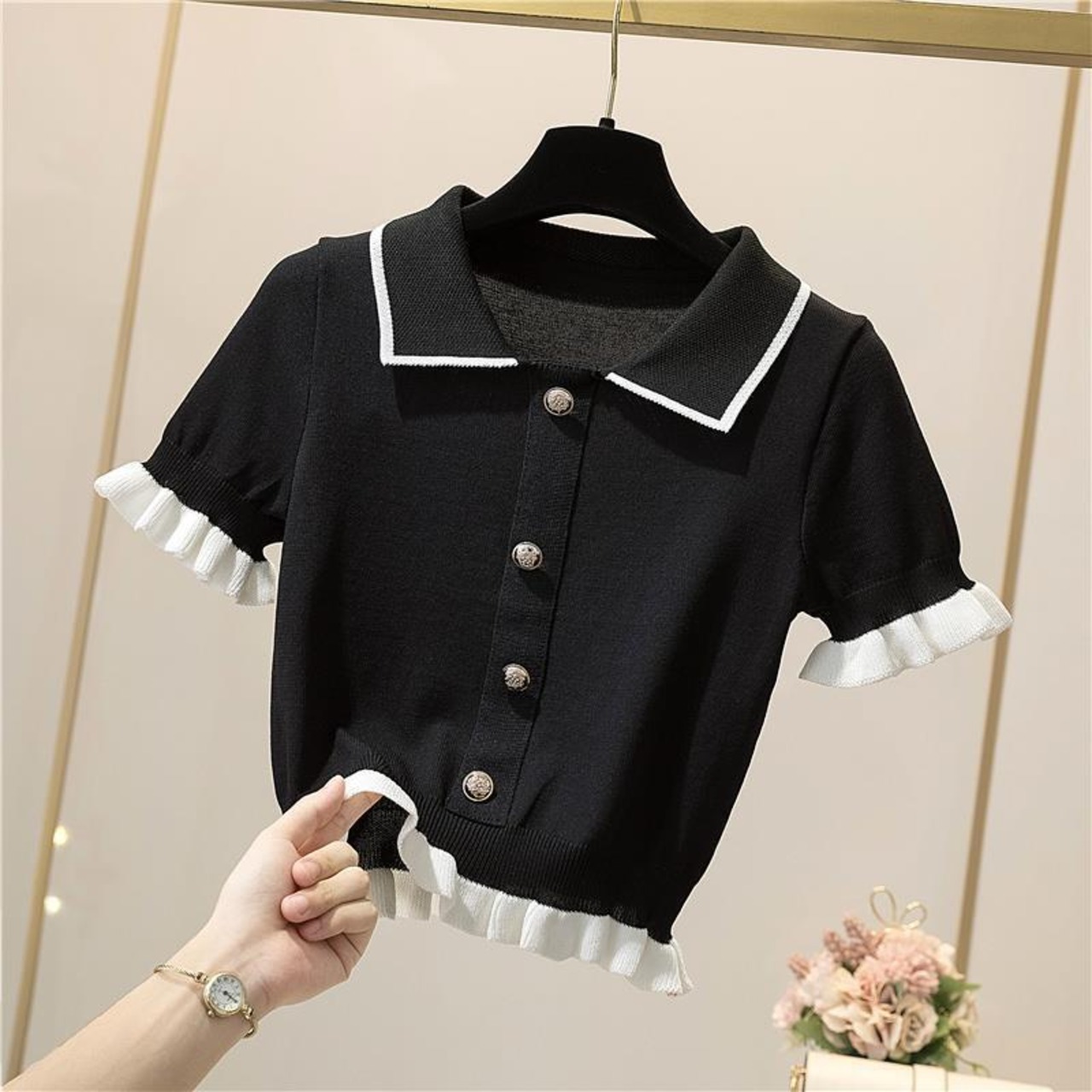女性の夏のブラウス 2021 フリル ボタン アップ シャツ トップ半袖 T シャツ ストリート ショート ハーフスリーブ ラッフル サマー 夏物 Tシャツ