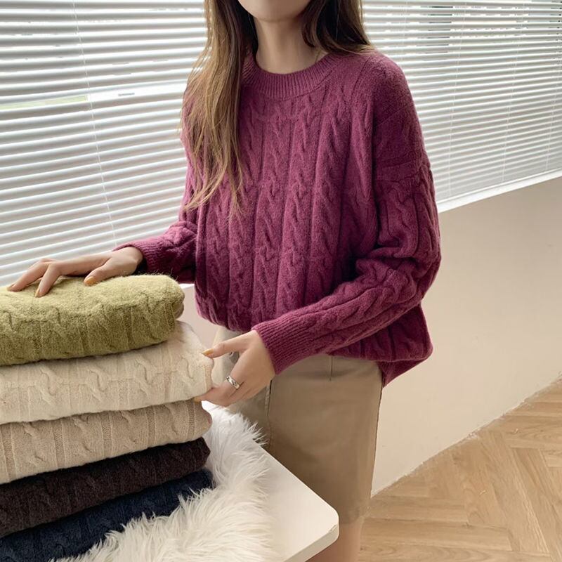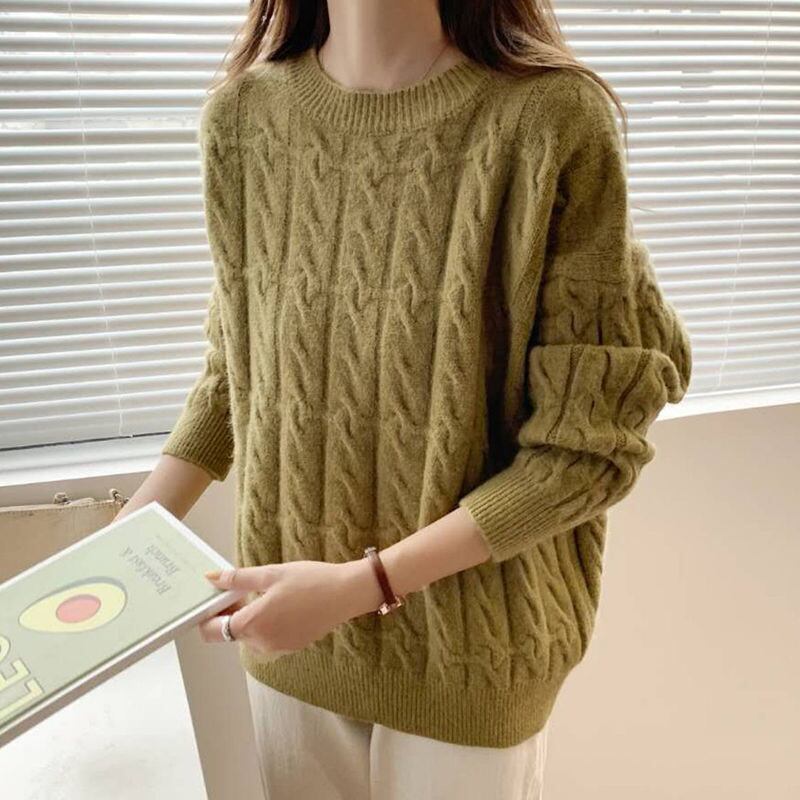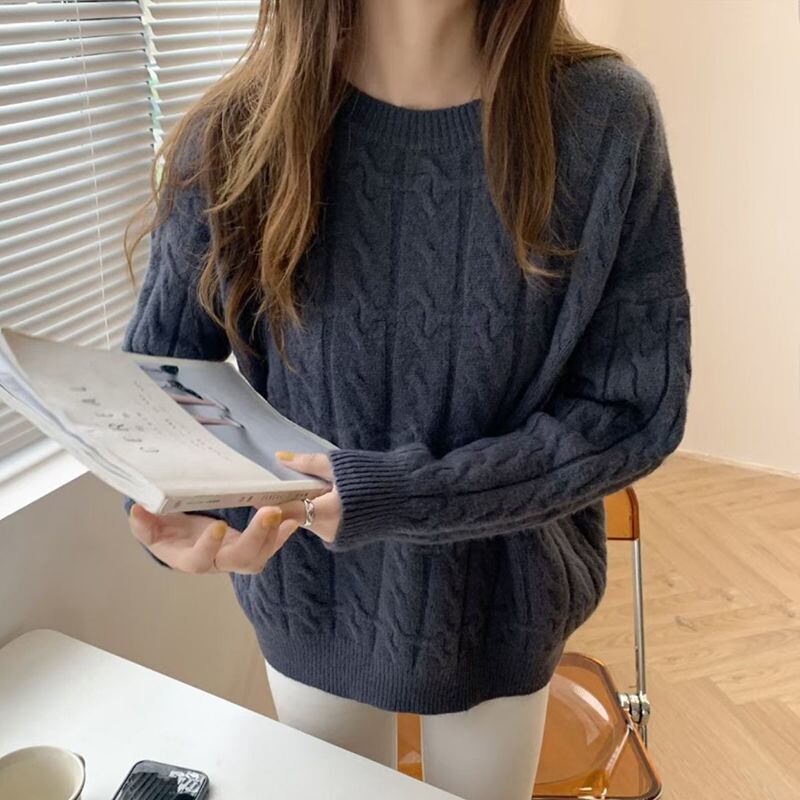 女性の冬バージョンゆったりと薄い怠惰なプルオーバー レトロ ツイスト ラウンド ネック無地ニット厚手セーター トップ ウィンター 冬物 Oネック ソリッドカラー